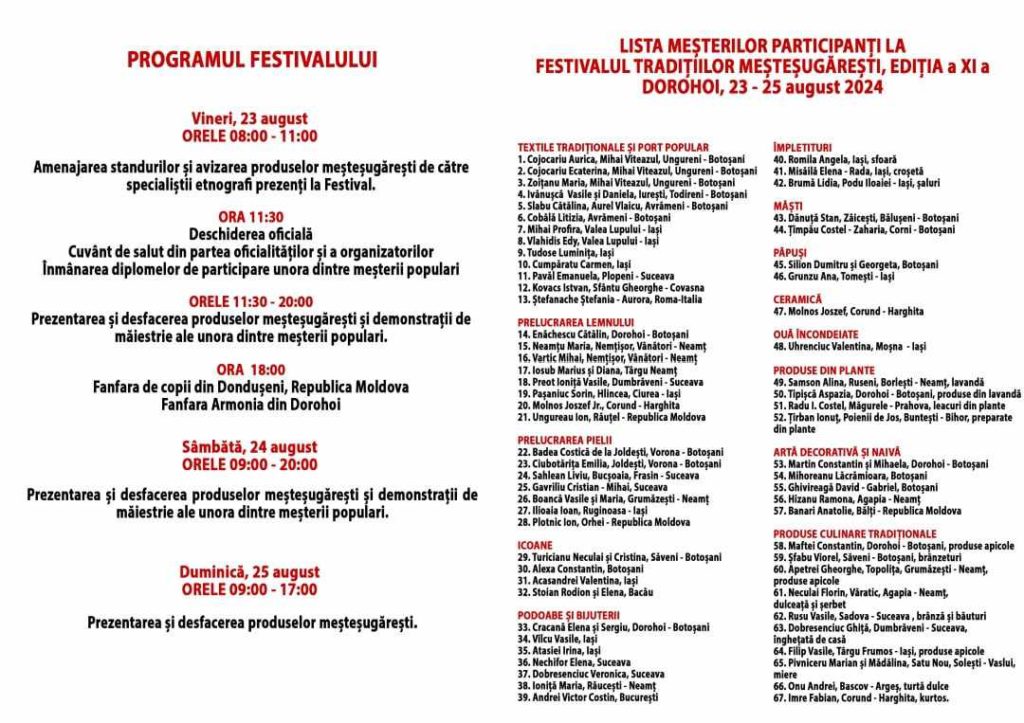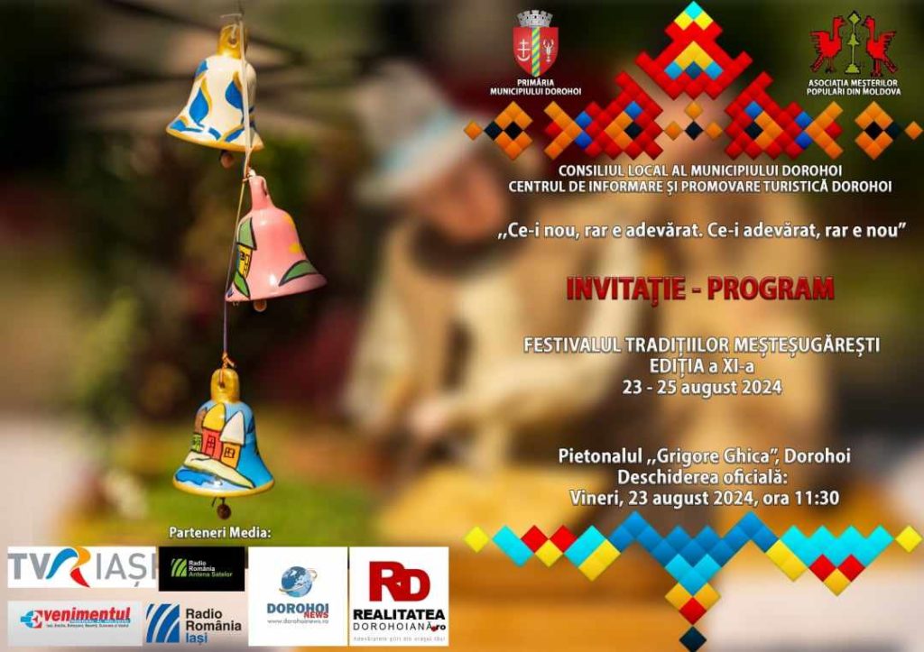 Primăria Municipiului Dorohoi, Consiliul Local al Municipiului Dorohoi, Asociaţia Meşterilor Populari din Moldova și Centrul Național de Informare și Promovare Turistică Dorohoi (CNIPT) organizează în perioada 23-25 august 2024 pe Pietonalul „Grigore Ghica” din centrul Municipiului Dorohoi cea de-a XI-a ediție a Festivalului Tradițiilor Meșteșugărești.