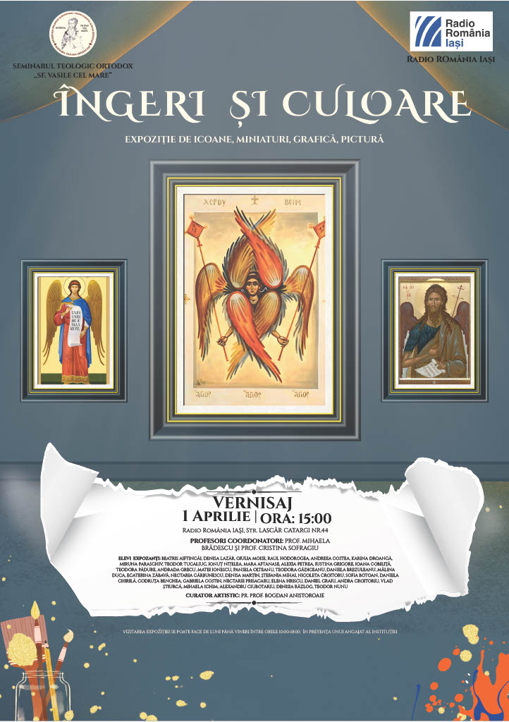 Seminarul Teologic Ortodox „Sf. Vasile cel Mare” din Iași ne aduce în atenție Expoziția de icoane, miniaturi, grafică și picturi ale elevilor săi, intitulată „ÎNGERI ȘI CULOARE”. Vernisajul are loc miercuri, 1 aprilie, de la ora 15:00, la sediul nostru din str. Lascăr Catargi nr. 44. Profesori coordonatori: Mihaela Brădescu, Cristina Sofragiu Prezintă Preot Prof. Bogdan ANISTOROAIE Vizitarea expoziției se poate face de luni până vineri între orele 10:00-18:00, în prezența unui angajat al instituției