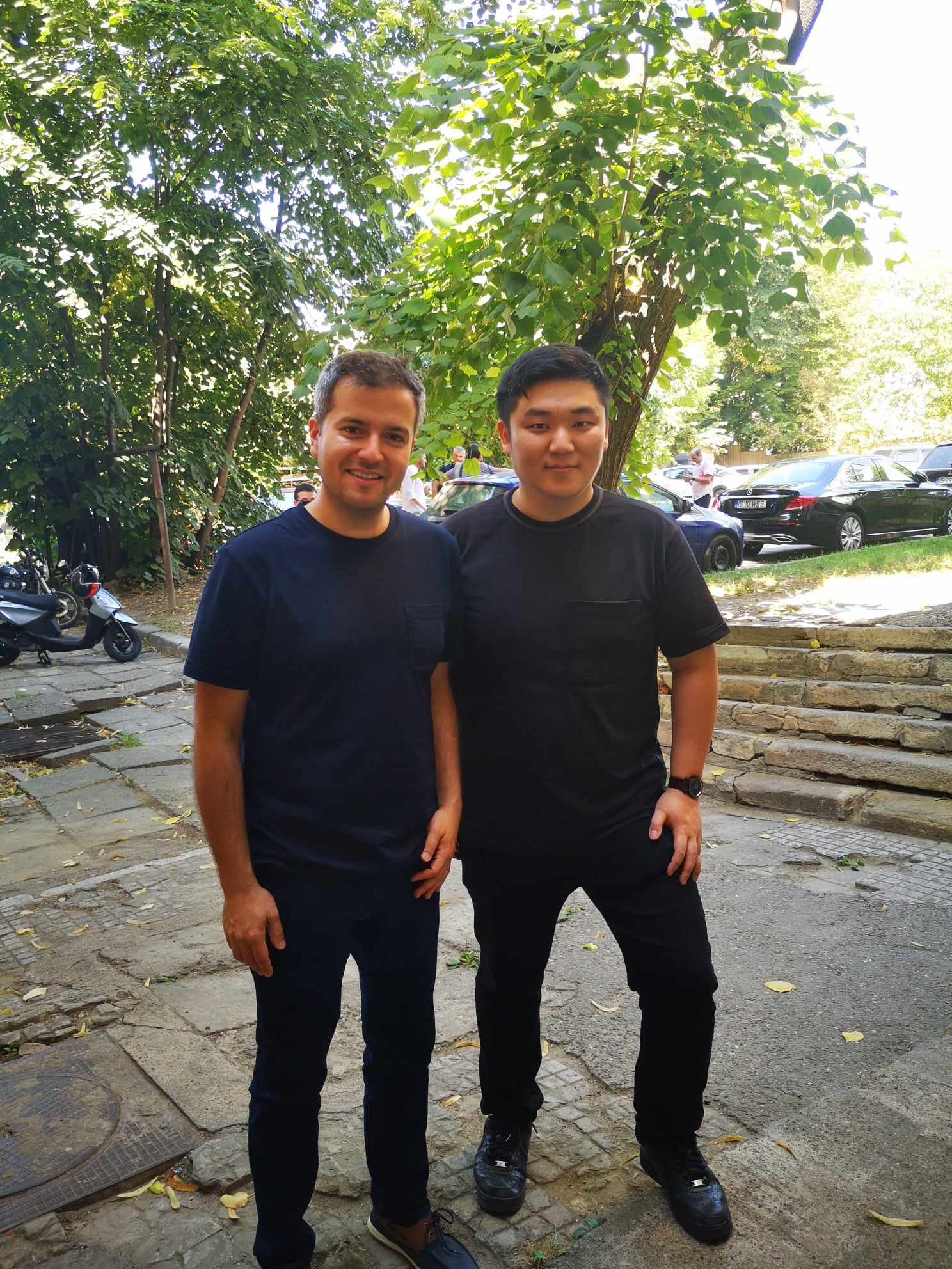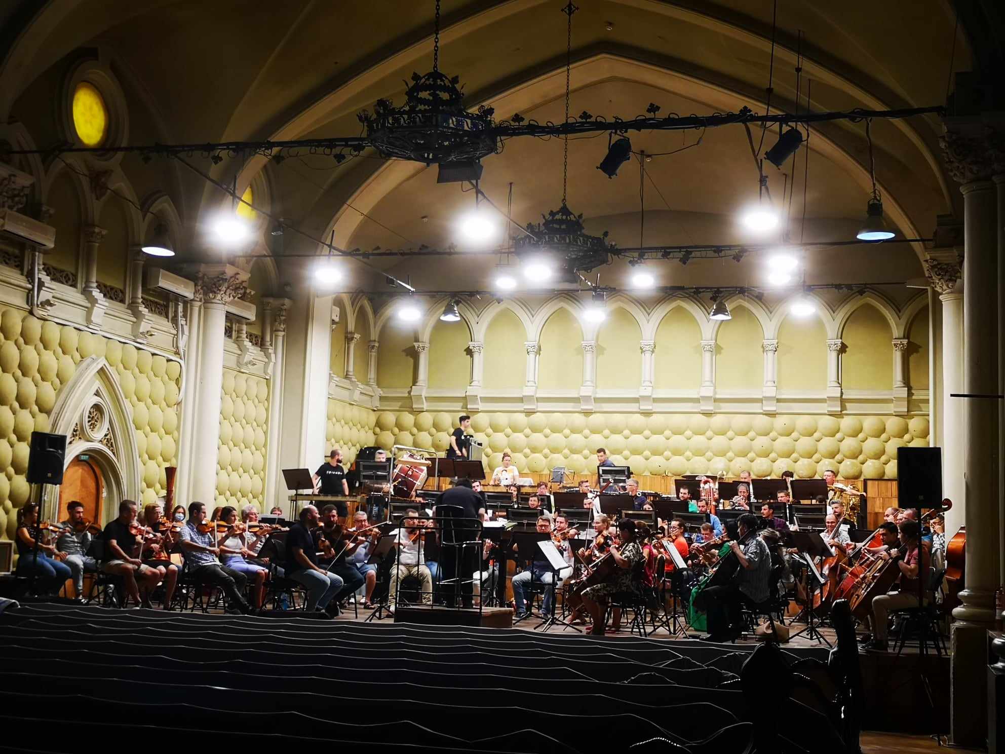 Două imagini de la repetiții, cu Orchestra Filarmonicii și cu Florian, alături de dirijorul Hankyeol Yoon