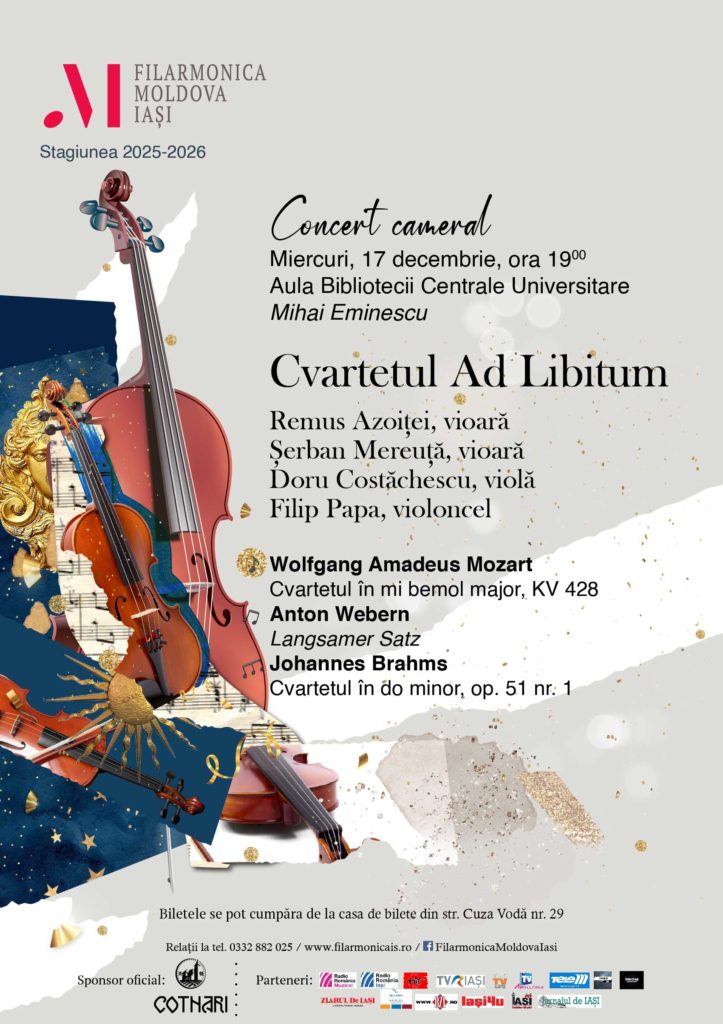 MIERCURI, 17 decembrie 2025 - ora 19:00 – CONCERT CAMERAL Aula Bibliotecii Centrale Universitare "Mihai Eminescu" Iași Cvartetul Ad Libitum al Filarmonicii "Moldova" din Iași,