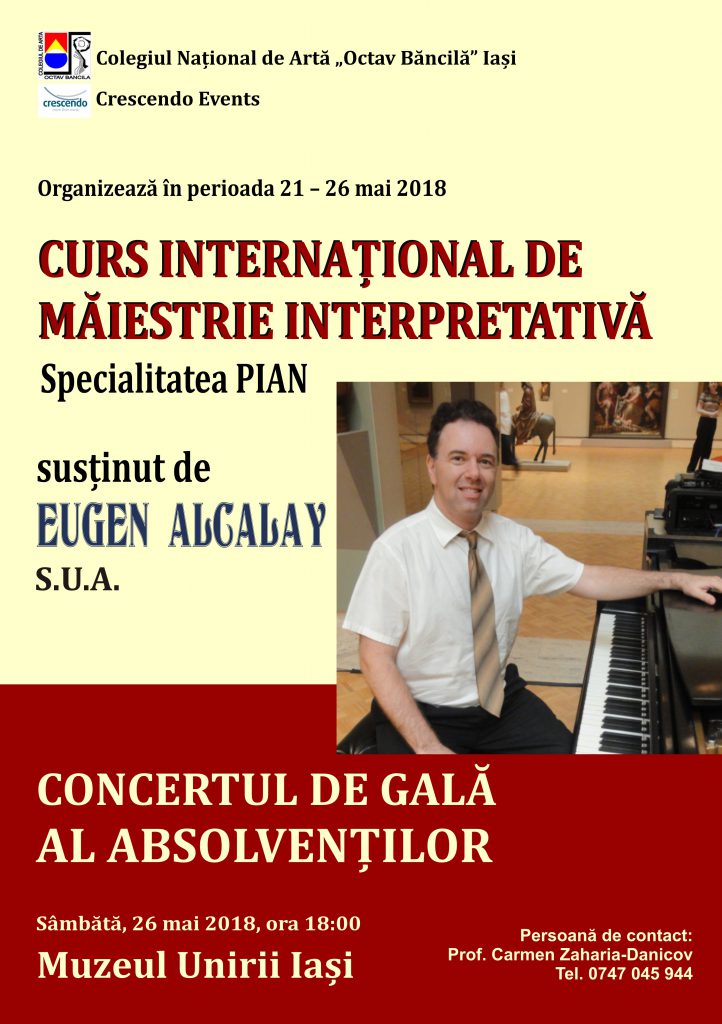 În organizarea Crescendo Events şi a Colegiului Naţional de Artă Octav Băncilă din Iaşi, vizitează Iaşul în săptămâna 21-27 mai 2018 pianistul Eugene Alcalay, din Statele Unite. Artist Steinway, bursier Fulbright și visiting profesor la Academia Crescendo Summer Institute of the Arts, domnul Alcalay va susține un mastercourse de pian la Colegiul Național de Artă ”Octav Băncilă” și un recital extraordinar, rogramat marți, 22 mai 2018, ora 18:00, la Palatul Culturii, sala Henri Coandă.
