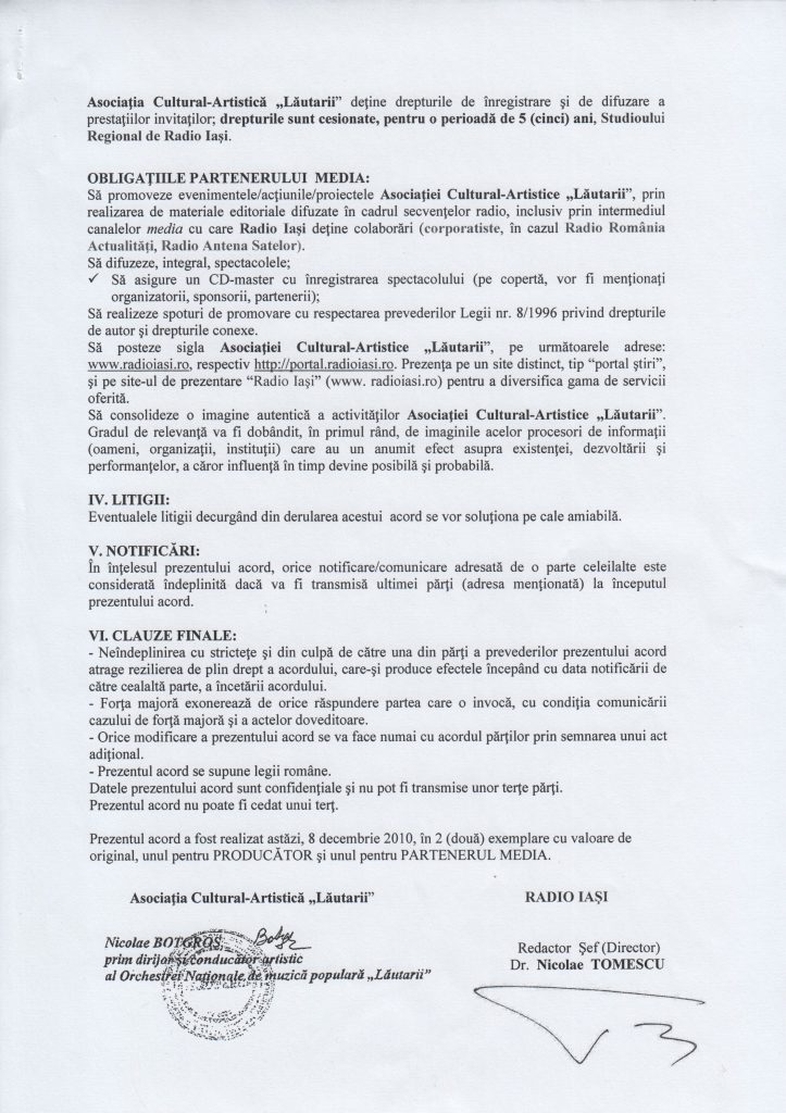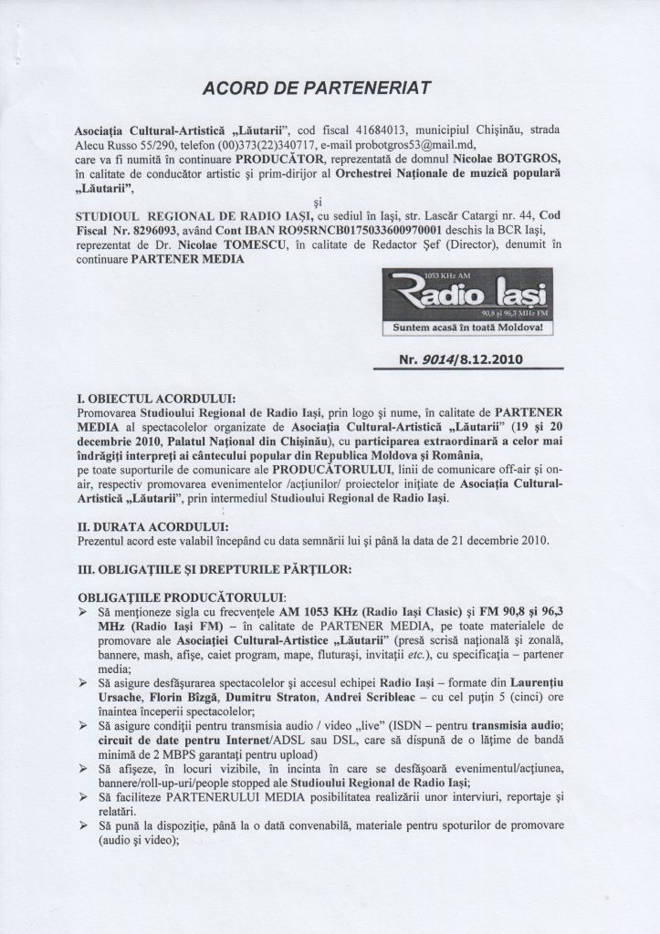 promovarea spectacolelor organizate (19 și 20 decembrie anul invocat, în „Palatul Național din Chișinău) de Asociația Cultural-Artistică „Lăutarii