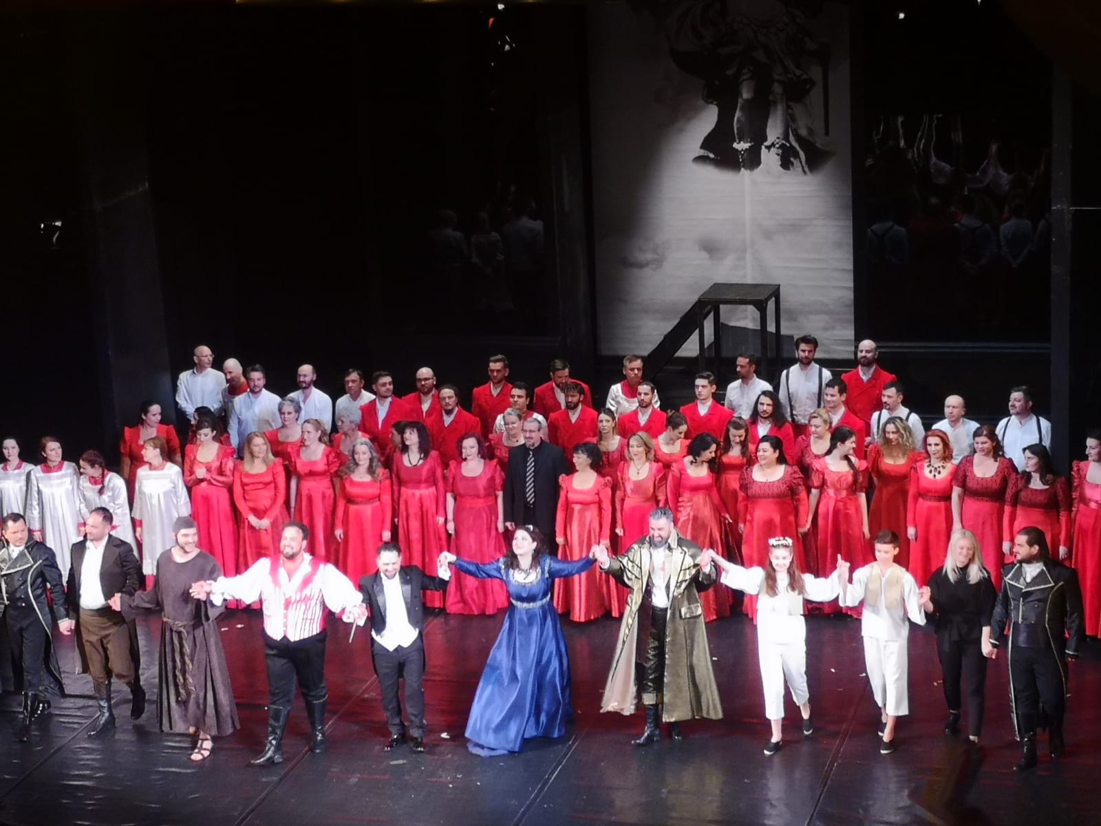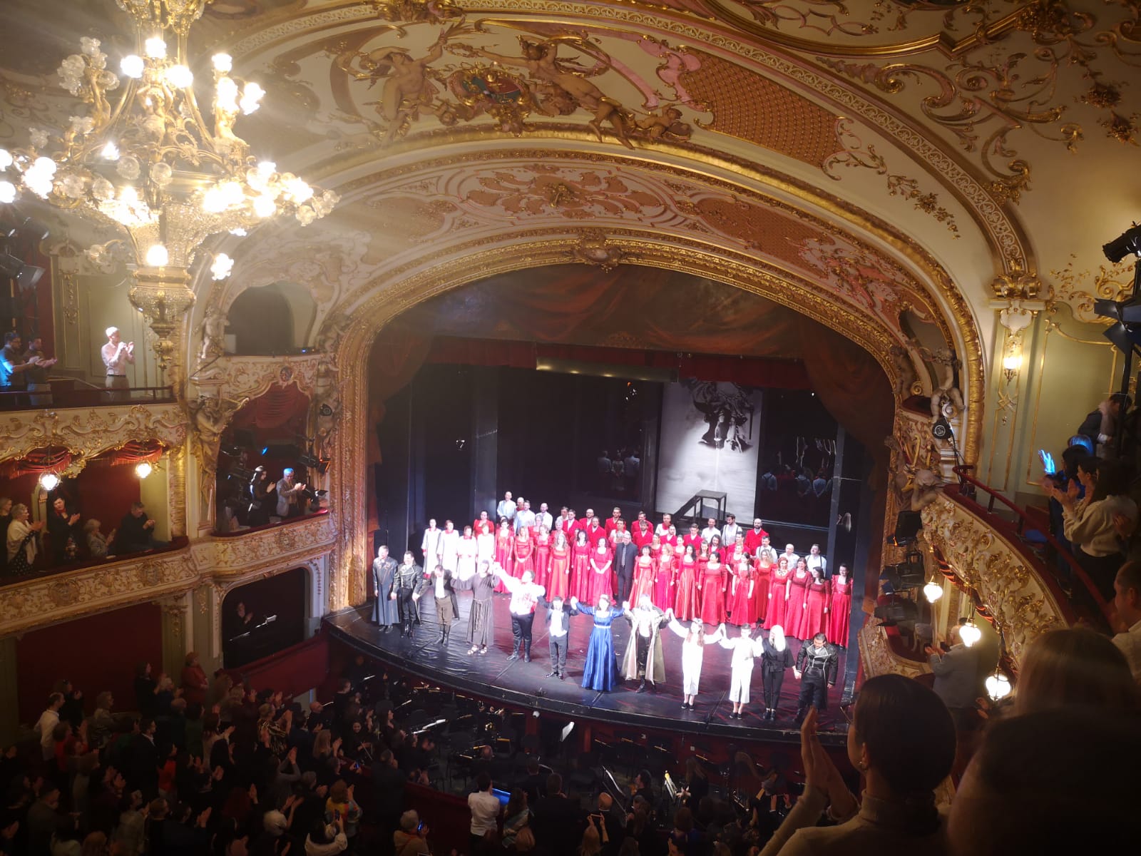 Am fost martorii unor interpretări impecabile și foarte emoționante, Cellia Costea, cu vocea ei care irizează aur, Ștefan cu felul de a fi atât de sincer și natural și cu strălucirea sclipitoare a acutelor din care nu dispare niciodată căldura și George, care a fost un Scarpia fără cusur, care te face să dai personajului circumstanțe atenuante (hahaaaa) deși am descoperit după cortină un tânăr domn răcit bocnă… Bine, circumstanțele le-a creat Cellia cu frumusețea ei și toți împreună cu o chimie formidabilă despre care scriam mai sus!… Ei ne-au dăruit un spectacol de o calitate demnă de cele mai mari scene din lume și nu e de mirare, Ștefan a debutat în rolul lui Mario Cavaradossi în 2022 la ROH Covent Garden din Londra, la Iași a venit după o Boema la Trondheim (Norvegia) și pleacă în Japonia, o destinație din ce în ce mai des onorată. Cellia este atât de iubită la Iași (în sfârșit, și-a dorit atât de mult să cânte aici, la câțiva kilometri de casa ei din România, dar parcă pârgul vocii ei bogate în armonice nu se putea împlini mai bine în altă parte decât în casa cealaltă, la Opera Națională din Atena…) Felicitări, dragii noștri, tuturor, ansamblul este atât de sigur pe partitură și a funcționat perfect sub bagheta lui Daniel Jinga, i-am apreciat mult pe toți, Octavin Ionescu în Sacristan, Daniel Mateianu în Angelotti, Ovidiu Manolache în Spoletta, Victor Zaharia și Petru Pavel în Temnicer, respectiv Roberti și am lăsat la final debutul foarte bun al lui Marius Mădălin Munteanu în Sciarrone. Roluri mici, dar onorate frumos, ca și corul pregătit de Manuel Giugula. Iar copii creează momentele lor de mare gingășie sub bagheta Ralucăi Zaharia, profesionalism, precizie și farmec în fiecare părticică de spectacol! Și ce minunați sunt cei doi păstori de-o șchioapă, Sofia Elena Neacșu și Lorenzo Marian Moise! Un mare bravo și mulțumiri ONRI!