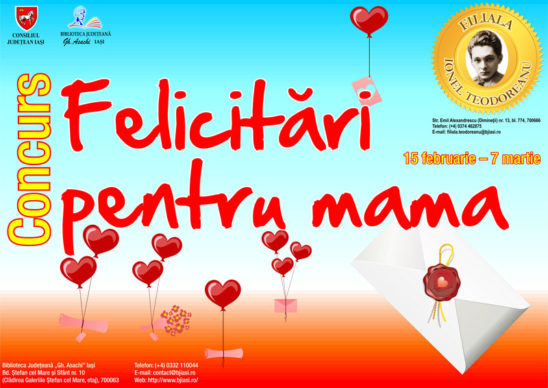 Tot Filiala „Ionel Teodoreanu” invită elevii să-și testeze imaginația în cadrul concursului de artă plastică Felicitări pentru mama, care se va desfășura până pe 7 martie a.c. Felicitările pot fi realizate conform dorinței, imaginației și posibilităților proprii. Originalitatea, acuratețea și amprenta personală în transpunerea temei – dragostea pentru mama, vor fi principalele criterii de selecție în jurizare.