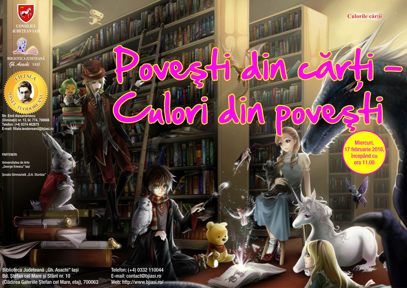 Biblioteca Judeţeană „Gh. Asachi” și Universitatea de Arte „George Enescu” Iași, alături de Școala Gimnazială „D.A. Sturdza” vă invită miercuri, 17 februarie 2016, începând cu ora 11.00, la Filiala „Ionel Teodoreanu” la activitatea de debut al proiectului  Povești din cărți – Culori din povești. Astfel, miercuri, 17 februarie, vizităm Filiala „Ionel Teodoreanu” (Str. Emil Alexandrescu/ Dimineții, nr. 13,  bl. 774), oferim doritorilor posibilitatea de a-și face permis de intrare, iar sâmbătă,  20 februarie, la ora 9.00, ne reîntâlnim pentru a alege și lectura fragmente literare ce le vom transpune apoi  în culori alături de Atelierul de Creație „Voroneț”, transformând povestea în creație artistică.