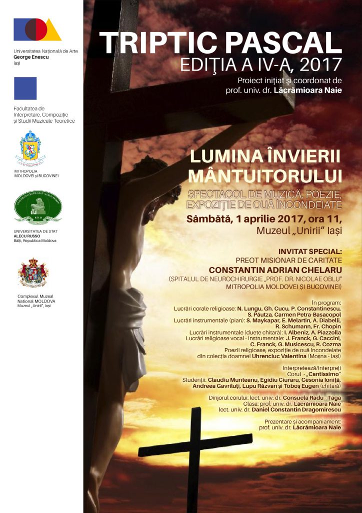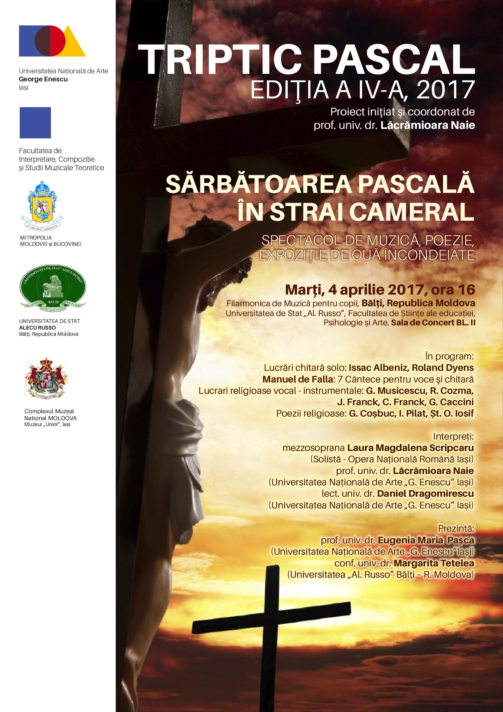 Universitatea Națională de Arte George Enescu din Iași anunță ediţia a IV-a a proiectului TRIPTIC PASCAL, iniţiat şi coordonat de prof.univ.dr. Lăcrămioara Naie și organizat împreună cu Mitropolia Moldovei și Bucovinei, Complexul Muzeal Național Moldova – Muzeul Unirii și Universitatea Alecu Russo din Bălți, Republica Moldova