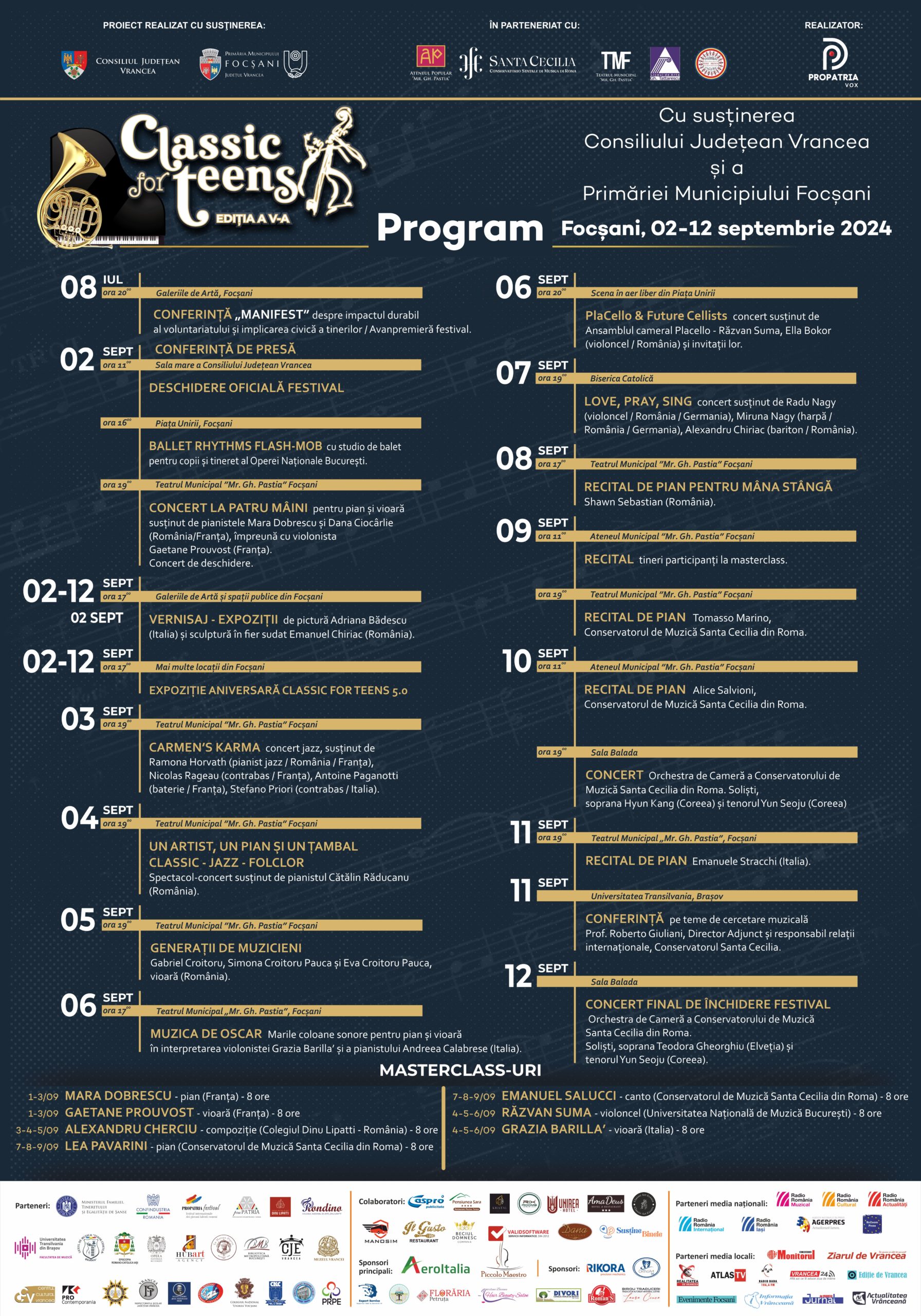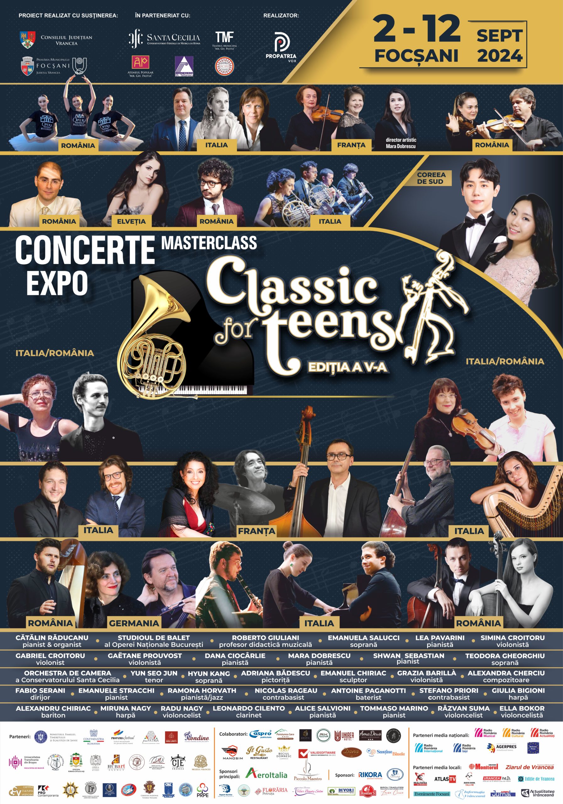 Aflăm mai multe detalii de la organizatori, prin Mioara Moraru, Manager al Festivalului“Pregătirile sunt în plină desfășurare. La Focșani e deja o atmosferă de entuziasm și așteptare. Cu noua ediție, ne propunem să spargem, la modul demonstrativ barierele culturale, sociale și etnice dintre stiluri muzicale diferite. Dimensiunea muzicală e un fenomen care separă cel mai mult oamenii din punct de vedere social, mai mult chiar decât standing-ul financiar. Prin evenimentele care vor avea loc in aer liber, Ballet Rithm Flash Mob și cu ansamblul de violoncele Placello, venim în întâmpinarea acelui public care încă nu a avut ocazia să se întâlnească până acum cu genuri diferite de muzică. Pregătim un public nou, care în următorii zece ani va umple din nou sălile de concerte și cultivăm preferințe muzicale. Classic for Teens nu este doar un Festival de muzică clasică. Este un simbol al potențialului pe care orașele de provincie îl au în dezvoltarea și promovarea culturii la nivel național și internațional. Focșaniul, prin găzduirea a unui eveniment unic, demonstrează că muzica clasică poate să prospere și să inspire oriunde există dorința de a cultiva frumosul, transformând orașul într-un adevărat centru al excelenței culturale. Classic for Teens, aflat în efervescența creșterii, indiferent de context și obstacole, a reușit să aducă pe scenele instituțiilor de cultură din Focșani titani contemporani ai muzicii clasice. Ei devinîntr-o scurtă, dar fructuoasă perioadă de timp, mentori pentru tânăra generație”.