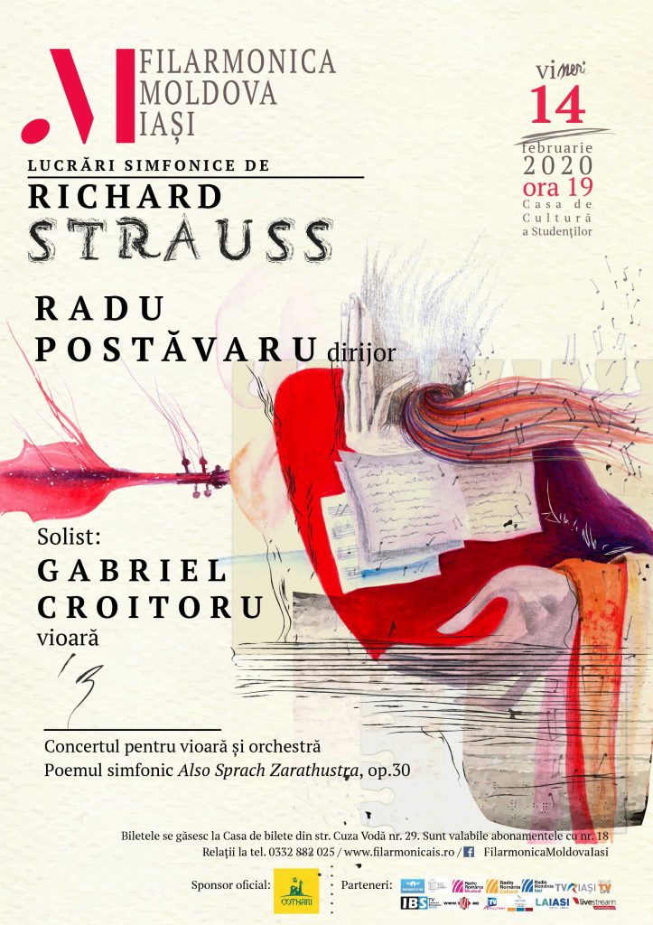 Orchestra simfonică a Filarmonicii Moldova din Iaşi susţine vineri, 14 februarie, un concert simfonic dedicat operei compozitorului german Richard Strauss. O adevărată odisee spaţială a iubirii, pentru cei care o sărbătoresc în această zi specială (Fanfara iniţială a devenit celebră după folosirea ei în filmul lui Stanley Kubrick din 1968, „2001: A Space Odyssey”). Şi alegerea Concertului pentru vioară ne aminteşte de anii primelor iubiri, fiind creat de compozitor la doar 17 ani. În schimb, pentru interpretarea lui, a fost ales un solist pentru care publicul ieşean are o iubire veche şi stabilă, marele violonist Gabriel Croitoru, iar dirijorul concertului este dintre cei pe care îi vom aştepta mereu aici, acasă, cu toată dragostea, Radu Postăvaru.
