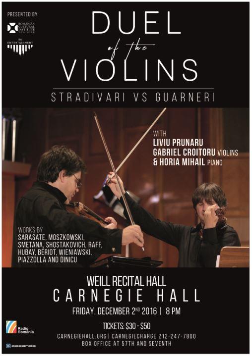 După şase ediţii de mare succes pe scenele din România şi Europa, Turneul Duelul Viorilor. Stradivarius versus Guarneri, un proiect Radio România, va fi prezentat în două prestigioase săli de concert: la Carnegie Hall (Weill Recital Hall), din New York, în 2 decembrie, de la ora 20:00, şi la Kennedy Center for the Performing Arts (Family Theater), din Washington, DC, în 5 decembrie, de la ora 18:00. Evenimentele, care au loc cu prilejul Zilei Naţionale a României, sunt organizate de către Institutul Cultural Român de la New York, în parteneriat cu RA-Entertainment şi Ambasada României în Statele Unite ale Americii.