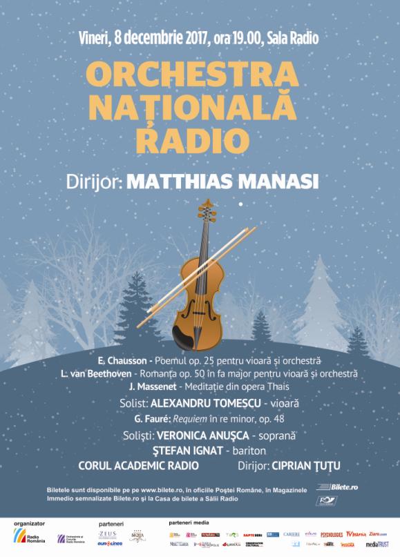 Sub bagheta dirijorului Matthias Manasi, programul serii va include, în prima parte, Poemul op. 25 pentru vioară şi orchestră, de E. Chausson, Romanţa op. 50 în fa major pentru vioară şi orchestră, de L. van Beethoven şi Meditaţie din opera Thaïs de Jules Massenet. Solistul invitat al primei părţi va fi violonistul Alexandru Tomescu.