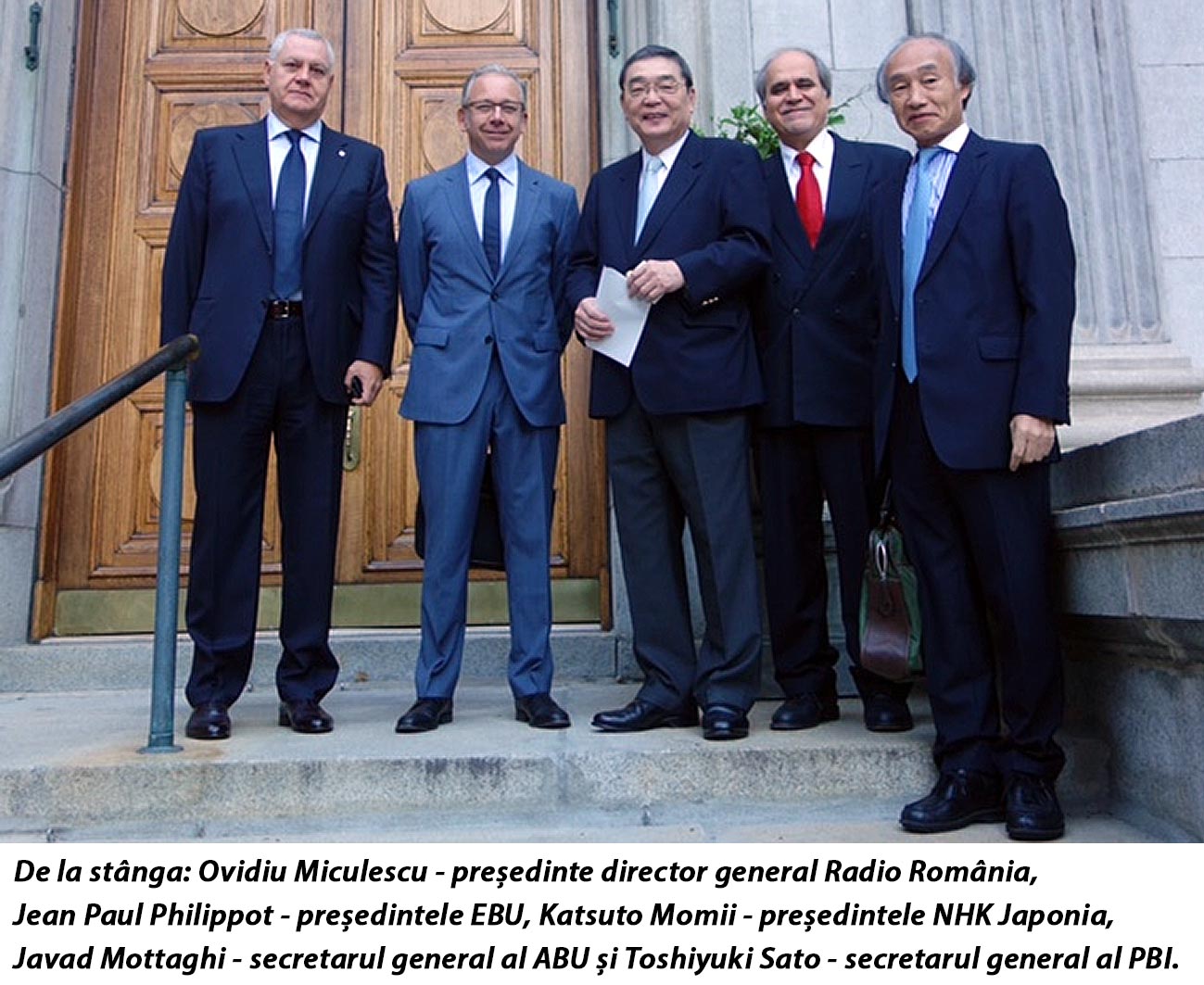 Foto1 PBI: De la stânga: Ovidiu Miculescu – Preşedinte Director General Radio România, Jean Paul Philippot – preşedintele EBU, Katsuto Momii – preşedintele NHK Japonia, Javad Mottaghi – secretarul general al ABU şi Toshiyuki Sato – secretarul general al PBI.
