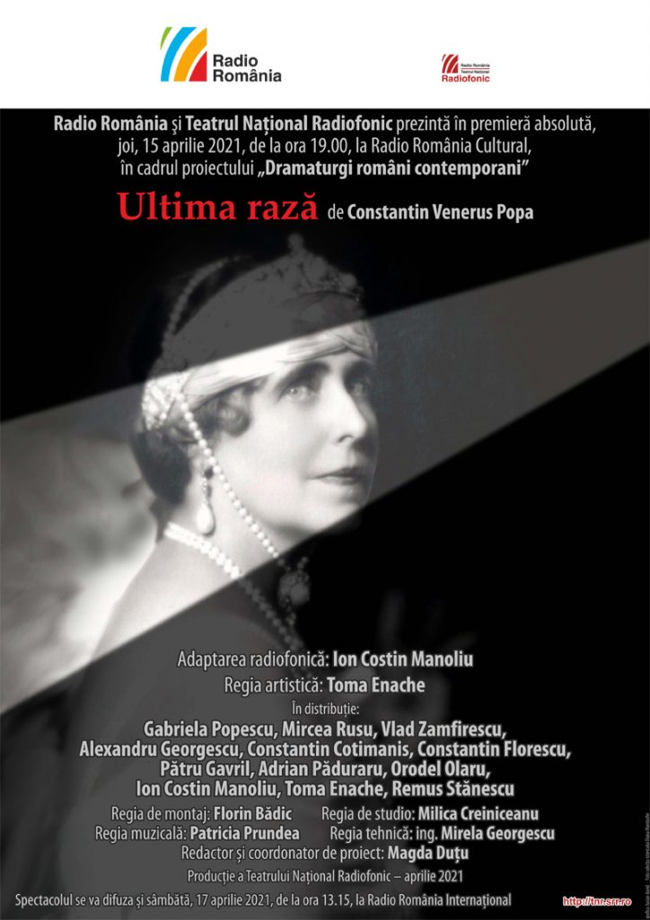 Spectacolul radiofonic Ultima rază, este realizat în cadrul proiectului Dramaturgi români contemporani, după piesa omonimă a dramaturgului Constantin Venerus Popa, colaborator al Teatrului Național Radiofonic, începând cu anul 2006. Subiectul piesei este inspirat de evenimente reale (foarte documentate de către autor) și aduce în prim-plan, personalități ale istoriei României: Regina Maria, Regele Carol al II-lea, Prințul Nicolae, diplomatul și omul politic Constantin Argetoianu, aghiotantul și secretarul particular al Reginei Maria, generalul Eugen Zwiedineck, episcopul romano-catolic Anton Durcovici, istoricul, criticul literar, ziaristul, dramaturgul, parlamentarul, prim-ministrul Nicolae Iorga, ziaristul Grigore Malciu, fost director şi co-proprietar al cotidianului ”Informaţia zilei” din Bucureşti, unde a publicat în 1943, celebrul pamflet intitulat Baroane, scris de Tudor Arghezi contra baronului Manfred von Killinger, ambasadorul Germaniei hitleriste la Bucureşti. Acțiunea se petrece într-un spațiu concentraționar – Închisoarea Jilava, Fortul 13, Celula nr.8, anii 1950 – 1951, cu trimiteri în anul 1931, la Palatul Regal, unde este reliefată, pe de o parte, relația dură, tensionată, între Regele Carol al II-lea, fratele său, Prințul Nicolae și Regina Maria, în ultima perioadă a vieții sale și, pe de altă parte, relația sentimentală, cu totul specială, dintre regină și aghiotantul său, generalul Zwiedineck.