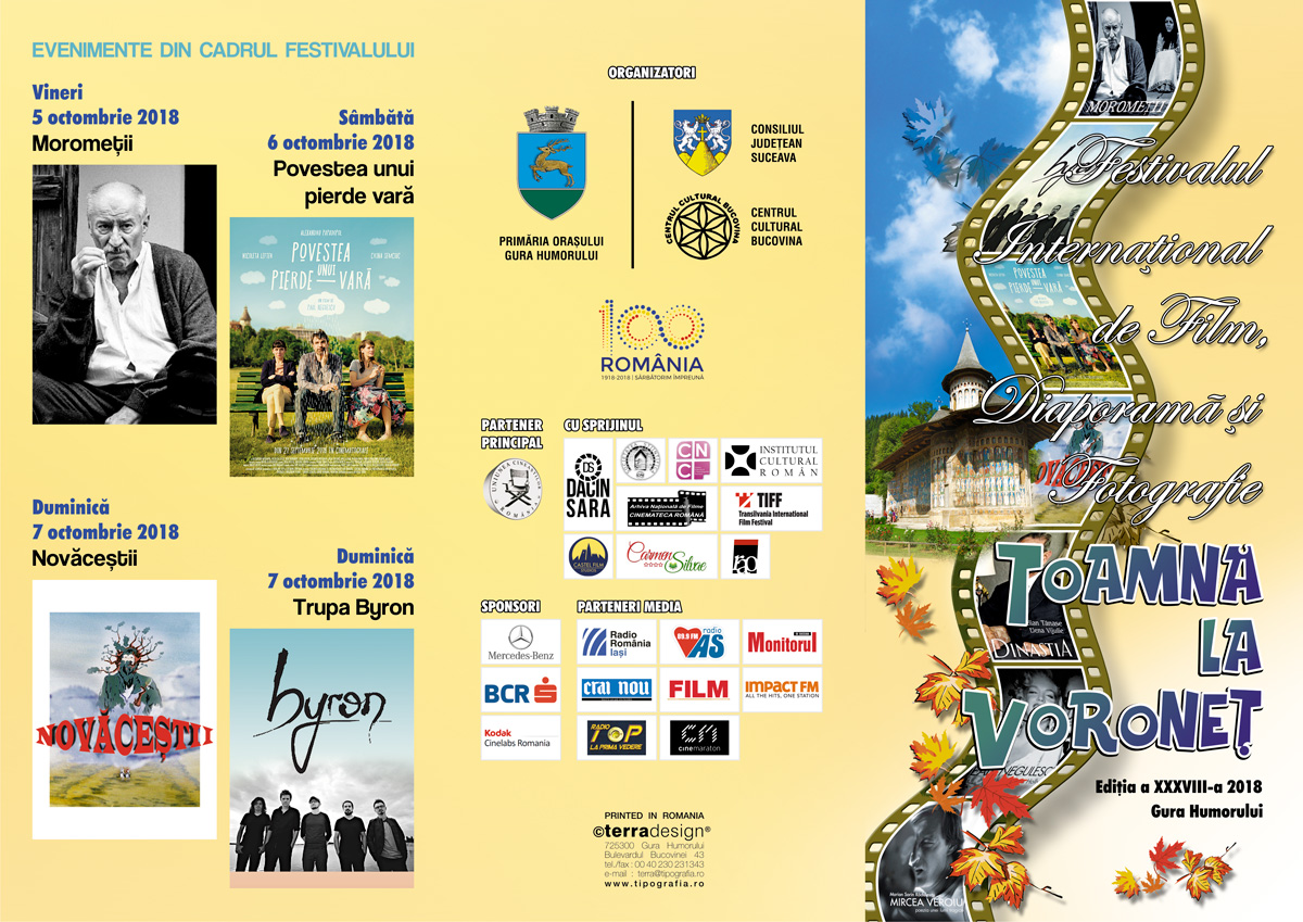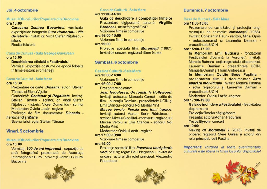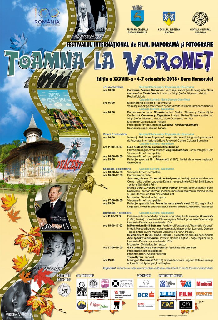 Organizatorul – Primăria Gura Humorului, co-organizatorii – Consiliul Județean Suceava și Centrul Cultural Bucovina, alături de partenerii lor, vă invită să evadați din cotidian și să veniți în lumea Festivalului Internațional de Film, Diaporamă și Fotografie, „TOAMNĂ LA VORONEȚ”!