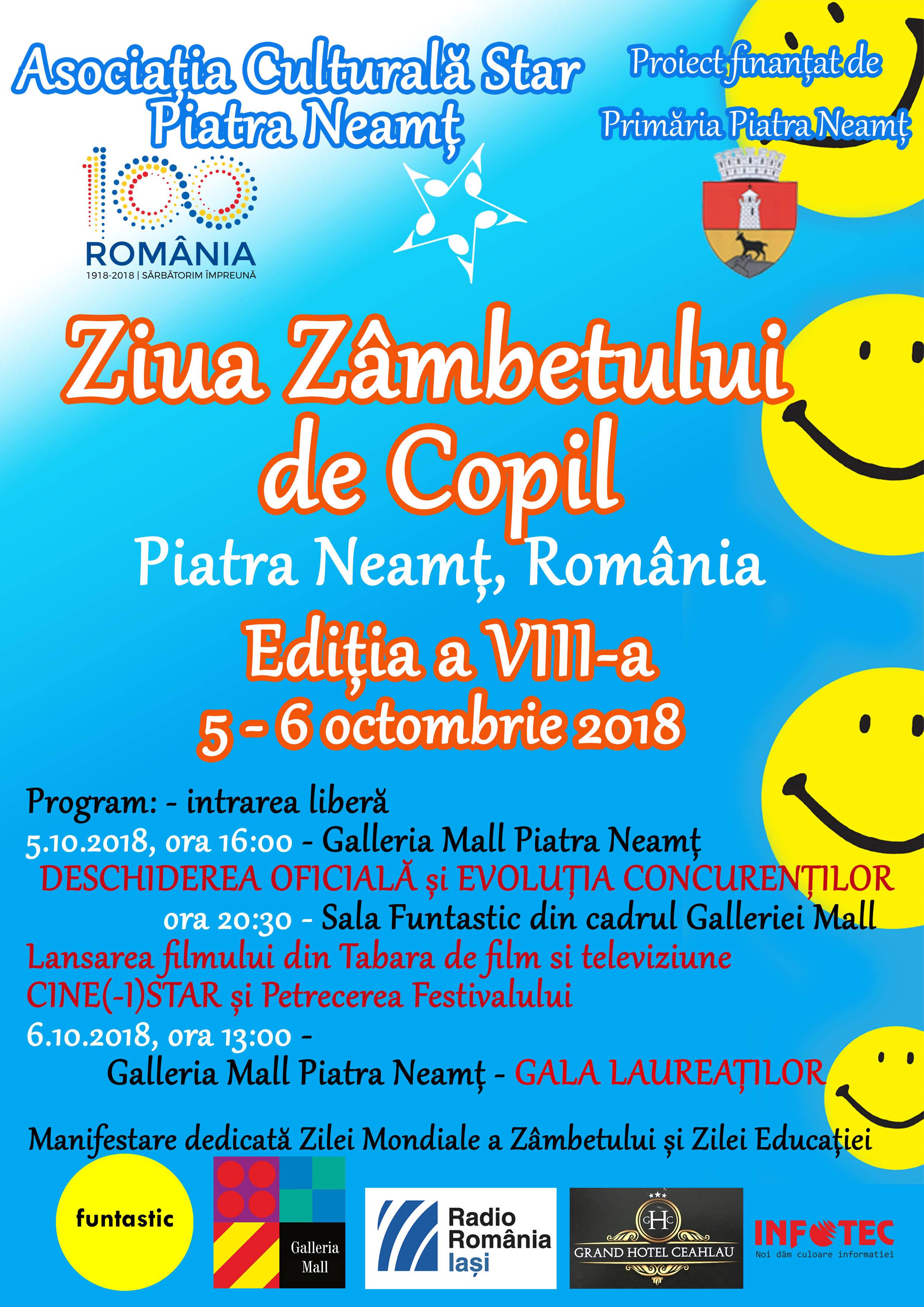 Asociația Culturală Star, organizează în perioada 04 – 06 octombrie 2018, ediția a VIII-a, a Festivalului Ziua Zâmbetului de Copil, în parteneriat cu Primăria Piatra Neamț și Galleria Mall Piatra Neamț.