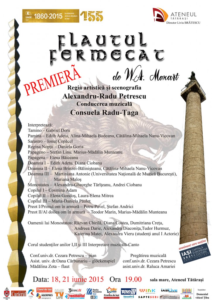 Universitatea de Arte “George Enescu” Iaşi vă invită la Premiera spectacolului de operă “Flautul fermecat” de Wolfgang Amadeus Mozart. Spectacolul va avea loc joi 18 iunie 2015, la Ateneul Tătăraşi, începând cu ora 19:00. Regia artistică şi scenografia sunt semnate de conf. univ. dr. Alexandru-Radu Petrescu, iar conducerea muzicală este asigurată de lector univ. dr. Consuela Radu-Ţaga. Vor interpreta studenţii de la specializarea Canto – Facultatea de Interpretare, Compoziţie şi Studii Muzicale Teoretice, cu participarea studenţilor din anul I de la Facutatea de Teatru, conf. univ. dr. Cezara Petrescu la pian, asist. univ. dr. Oana Cărbunariu la glockenspiel şi studenta Mădălina Zota la flaut. Pregătirea muzicală aparţine conf. univ.dr. Cezara Petrescu şi asist. univ. dr. Raluca Amariei.