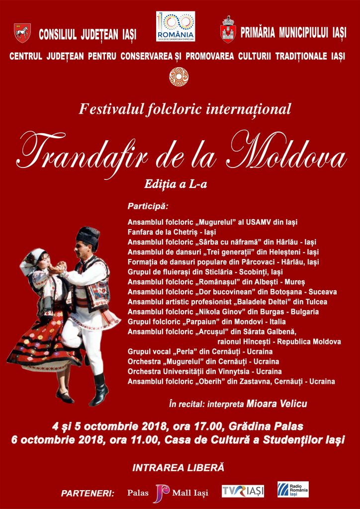 În zilele de 4, 5 și 6 octombrie 2018, Consiliul Judeţean Iaşi, prin Centrul Judeţean pentru Conservarea şi Promovarea Culturii Tradiţionale Iaşi, în parteneriat cu Primăria Municipiului Iaşi, organizează cea de a L-a ediţie (jubiliară) a Festivalului folcloric internațional „Trandafir de la Moldova”.