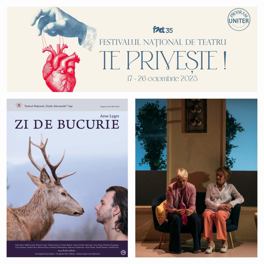O prezență constantă pe afișul Festivalului Național de Teatru de la București, Naționalul ieșean participă și la această ediție a renumitului eveniment teatral din capitală, cu cea mai recentă montare a regizorului Radu Afrim, „Zi de bucurie” de Arne Lygre. Spectacolul va avea loc pe 19 octombrie, ora 18:00, la Sala Studio a Teatrului Național „I.L. Caragiale”.