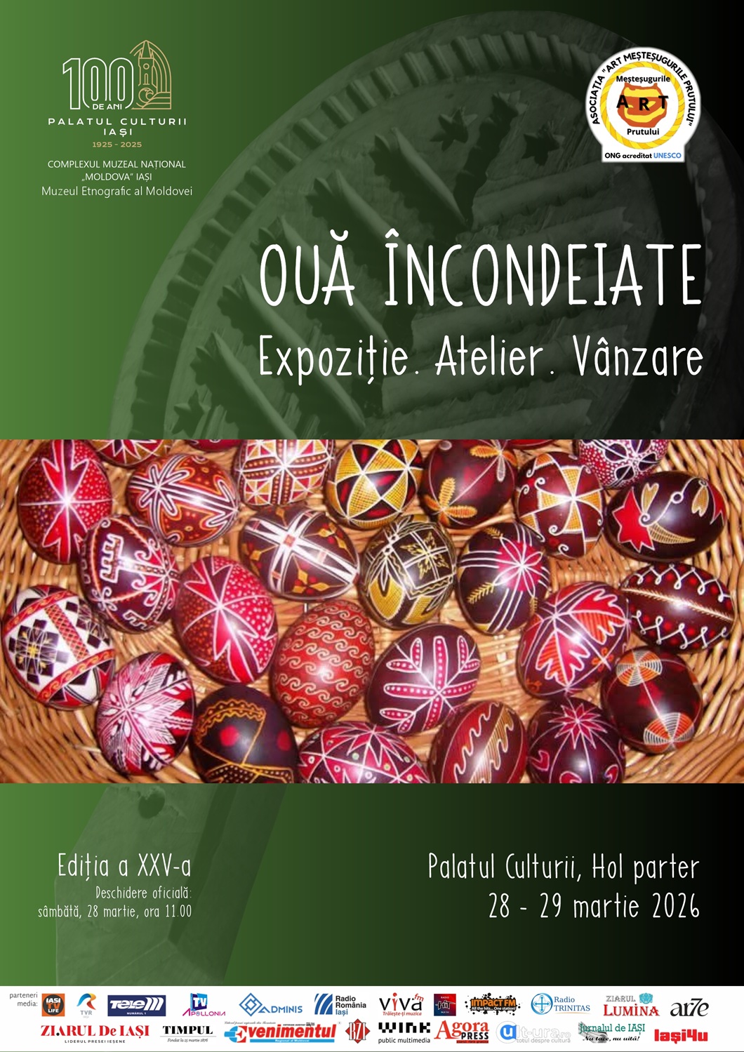 Muzeul Etnografic al Moldovei din cadrul Complexului Muzeal Național „Moldova” Iași, în parteneriat cu Asociația „ART – Meșteșugurile Prutului” Iași, organizează manifestarea interactivă „Ouă încondeiate. Expoziție. Atelier. Vânzare”, ce se va desfășura în zilele de 28 și 29 martie 2026, în Holul de la parterul Palatului Culturii.