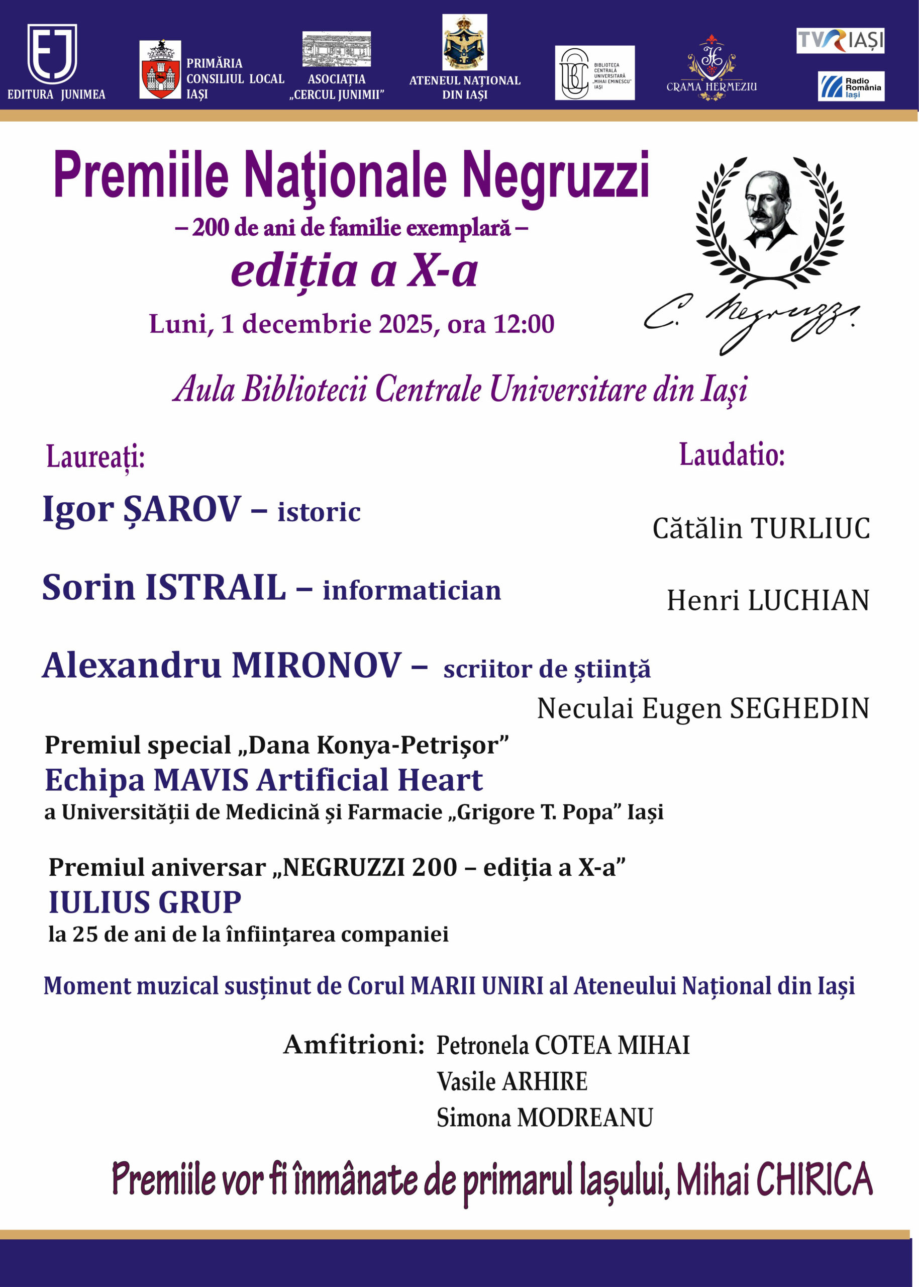Festivitatea de premiere din cadrul celei de-a X-a ediții a PREMIILOR NAȚIONALE NEGRUZZI-200 se va desfășura în Aula Bibliotecii Centrale Universitare „Mihai Eminescu”, luni, 1 Decembrie 2025, ora 12:00.
