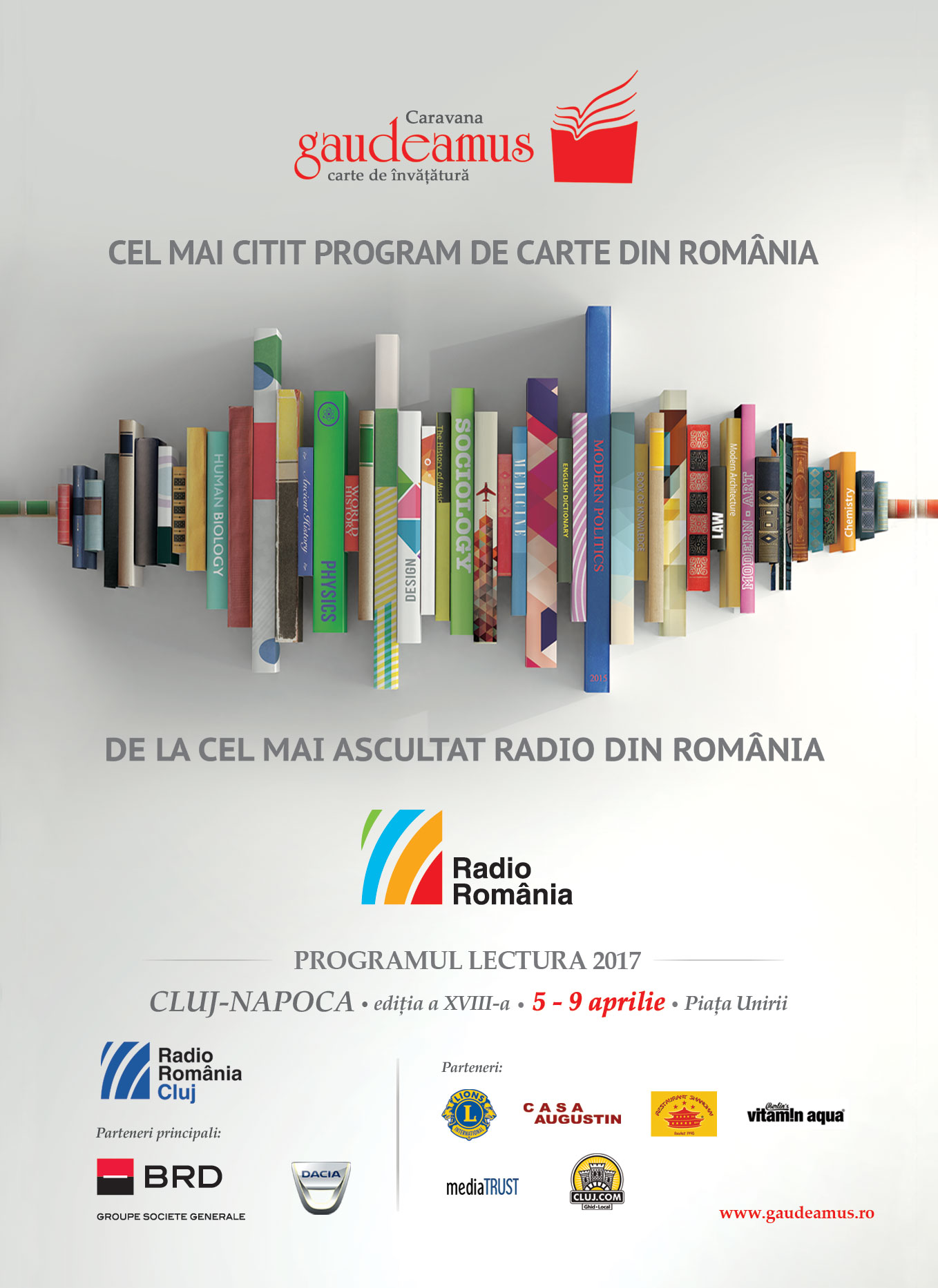 Radio România, reprezentat de Centrul Cultural Media şi Radio Cluj, vă invită aşadar, între 5 şi 9 aprilie în Piaţa Unirii, la un festin literar pentru toate vârstele şi gusturile, oferit de cel mai longeviv şi mai important eveniment din Transilvania, dedicat Cărţii: Gaudeamus Cluj-Napoca. În meniu: peste 60 de standuri şi mii de volume care abia aşteaptă să fie luate cu asalt de cititori, zeci de evenimente – majoritatea lansări şi prezentări de carte, muzică bună şi o tombolă cu premii pentru cumpărătorii de carte.