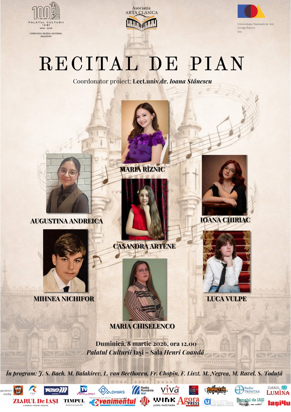 Programul recitalului susținut de Maria Rîznic, Ioana Chiriac, Augustina Andreica, Casandra Artene, Maria Chiselenco, Luca Vulpe și Mihnea Nichifor, cuprinde lucrări din creațiile compozitorilor: J.S. Bach, M. Balakirev, L. van Beethoven, Fr. Chopin, F. Liszt, M. Negrea, M. Ravel și S. Toduță.