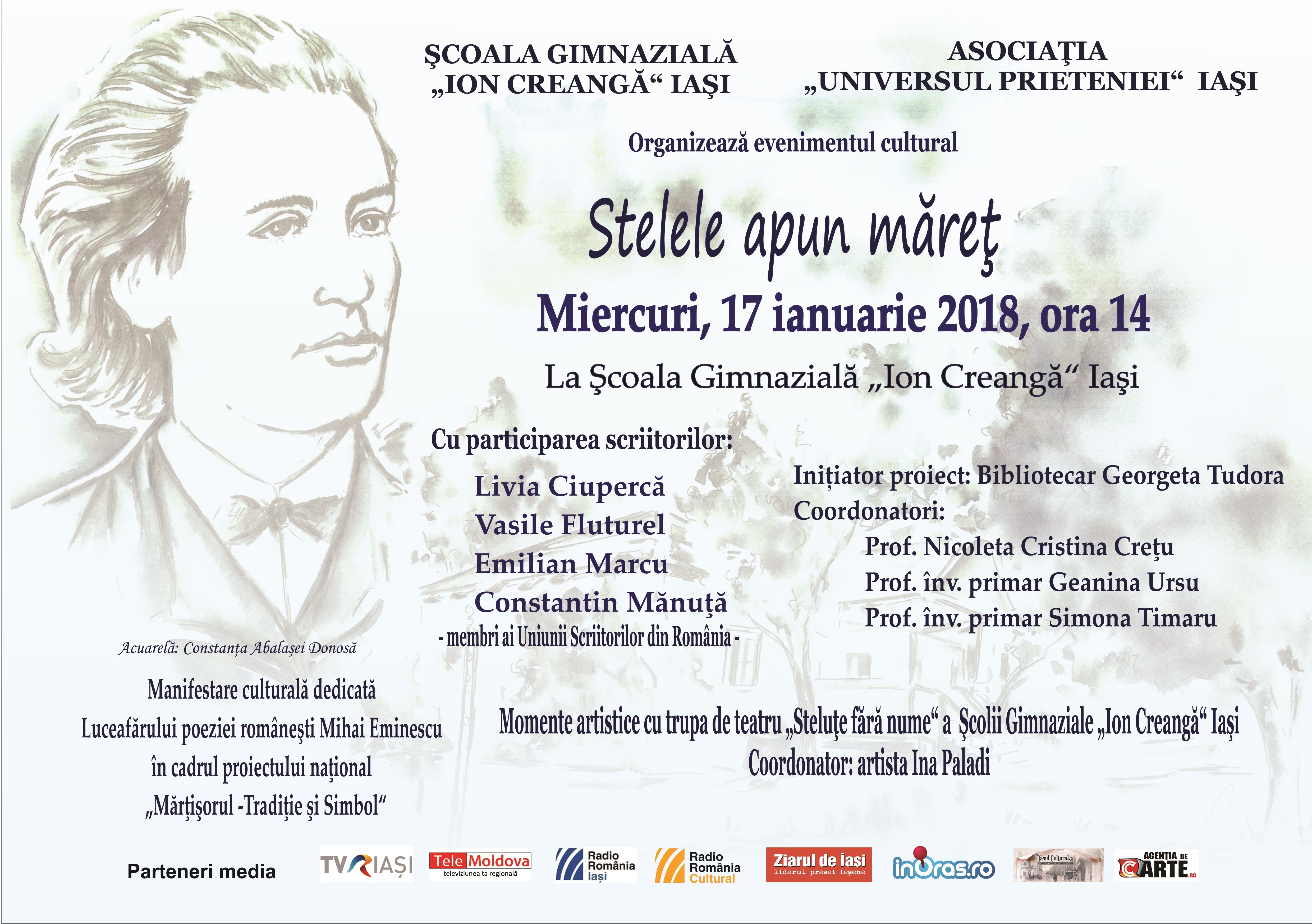 Şcoala Gimnazială „Ion Creangă” Iaşi şi Asociaţia „Universul Prieteniei” Iaşi organizează miercuri 17 ianuarie 2018, ora 14, evenimentul cultural „Stelele apun măreţ” pentru a marca împlinirea a 168 ani de la naşterea poetului Mihai Eminescu şi Ziua Culturii Naţionale.