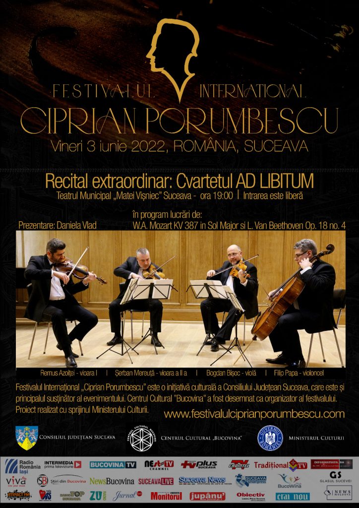 3 iunie 2022 ora 19.00 Teatrul Municipal „Matei Vișniec” – Recital Extraordinar Cvartetul AD LIBITUM