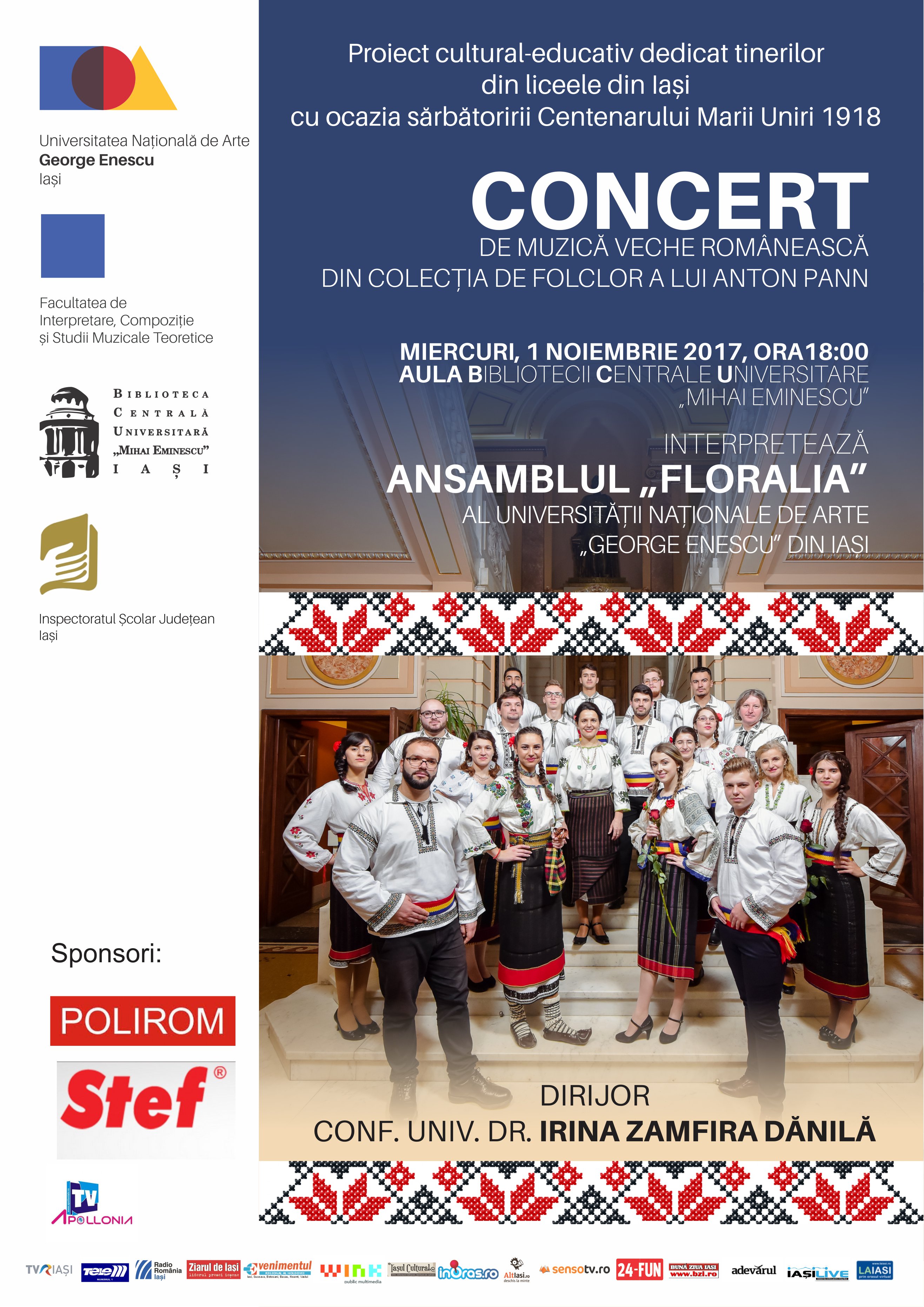 Miercuri, 01 Noiembrie 2017, ora 18:00, în Aula Bibliotecii Centrale Universitare „Mihai Eminescu” din Iași vă așteptăm la un concert de muzică veche românească din colecția de folclor a lui Anton Pann susținut de Ansamblul ”FLORALIA” – dirijor conf. univ. dr. Irina Zamfira Dănilă.