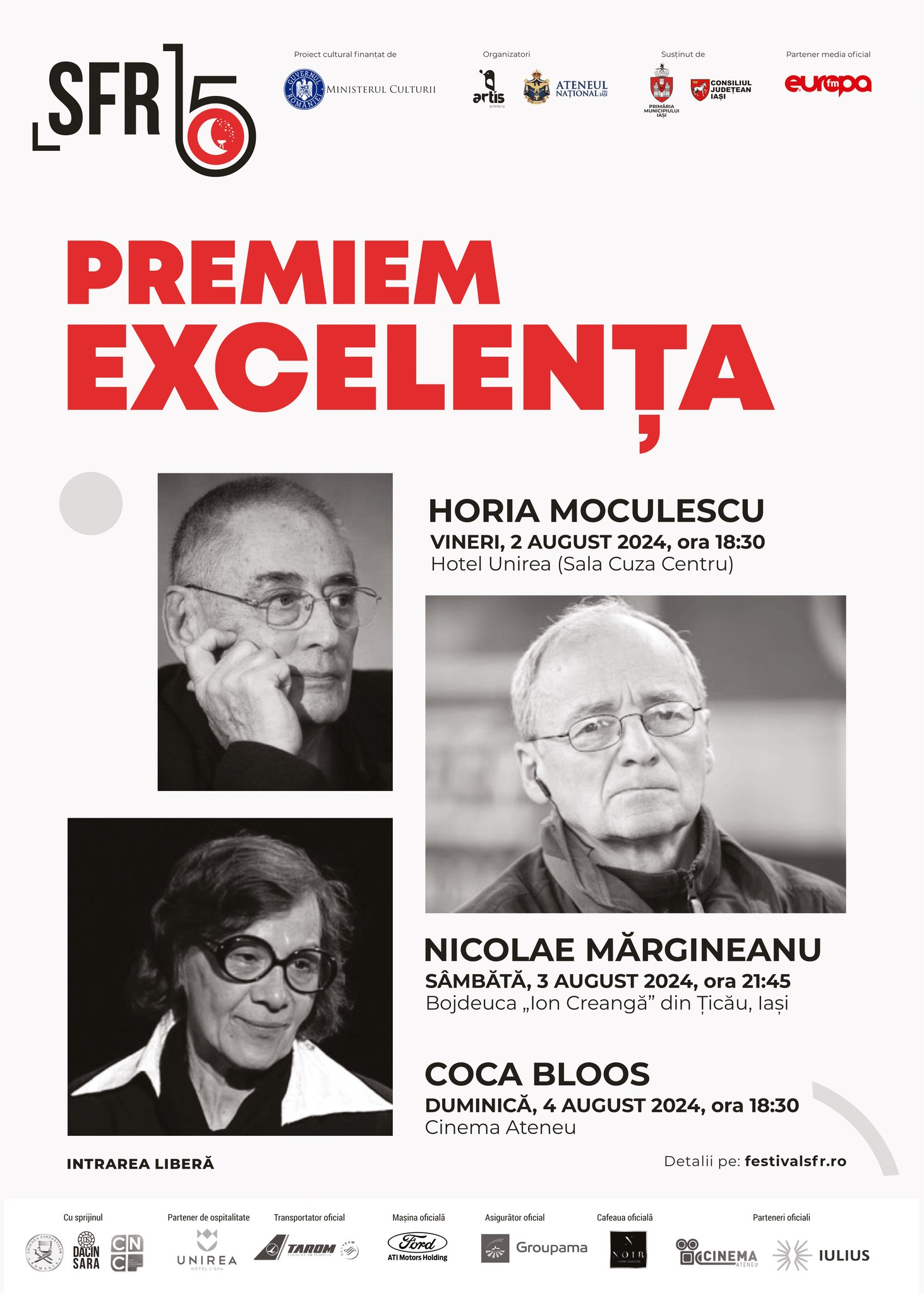 De asemenea, continuă tradiția premiilor de excelență pentru întreaga activitate artistică. Anul acesta, distincțiile vor fi acordate artistuluiHoria MoculescuHoria Moculescu, actriței Coca Bloos și regizorului Nicolae Mărgineanu, în cadrul a trei evenimente speciale dedicate recunoașterii contribuțiilor lor remarcabile.