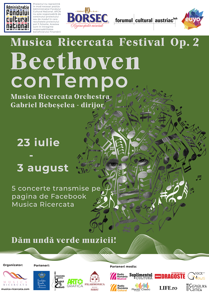 Ansamblul Musica Ricercata, alături de muzicieni din Orchestra de Tineret a Uniunii Europene (European Union Youth Orchestra), cu sprijinul Administrației Fondului Cultural Național (AFCN), Borsec și Forumului Cultural Austriac București, vă invită, în perioada 23 iulie – 3 august, la Festivalul Musica Ricercata Op. 2 – Beethoven conTempo, o serie de concerte unice în lume, care se vor desfășura în spațiul virtual, sub motto-ul Dăm undă verde muzicii!.