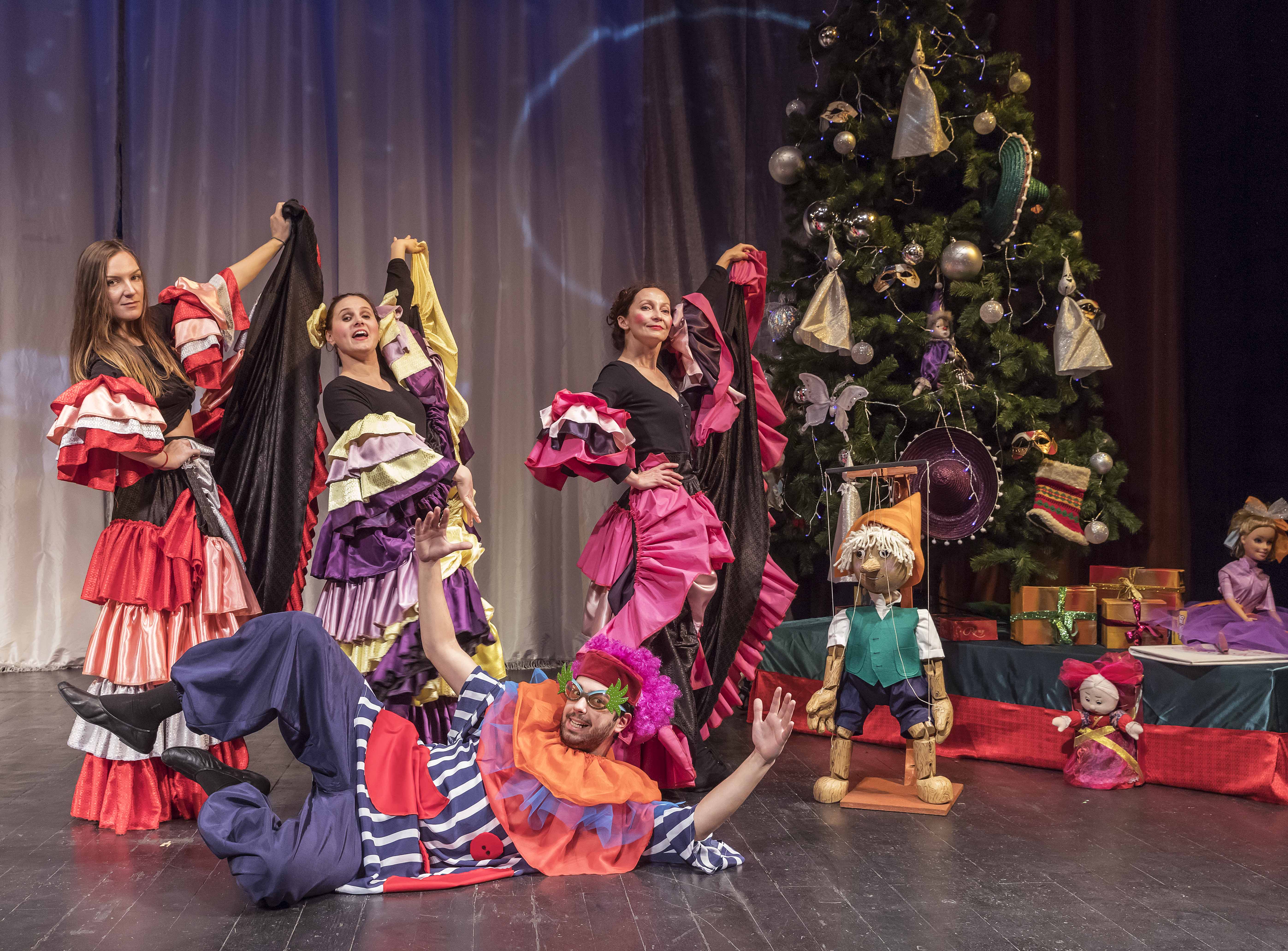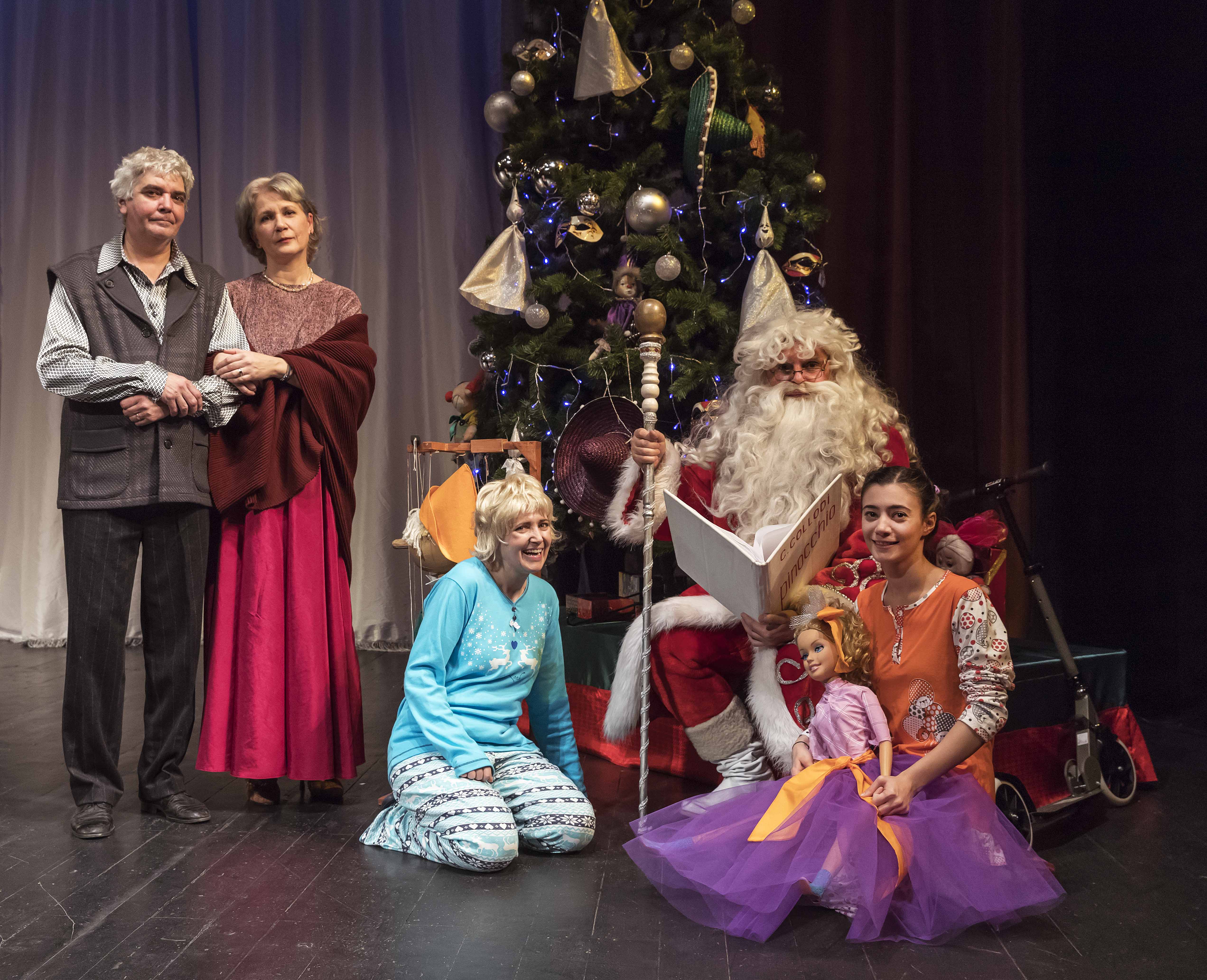 Scenografia spectacolului este realizată de Viorica Perju, muzica, de Radu Ștefan, iar dansurile sunt imaginate de Cristina Todi. În distribuție îi puteți urmări pe actorii Cristian Gheorghiu (Tatăl), Ileana Ocneanu (Mama), Iulia Deloiu Trif (Băiatul), Camelia Dilbea (Fata), Beatrice Volbea (Vulpea), Claudiu Gălățeanu (Motanul), Aurelian Diaconu (Moș Crăciun), Ionela Arvinte, Gabriela Andrei, Elena Zmuncilă, Cristian Gheorghiu, Emanuel Florentin, Dragoș Maftei (grupul Clovnilor, Stafiilor și Mexicanilor).
