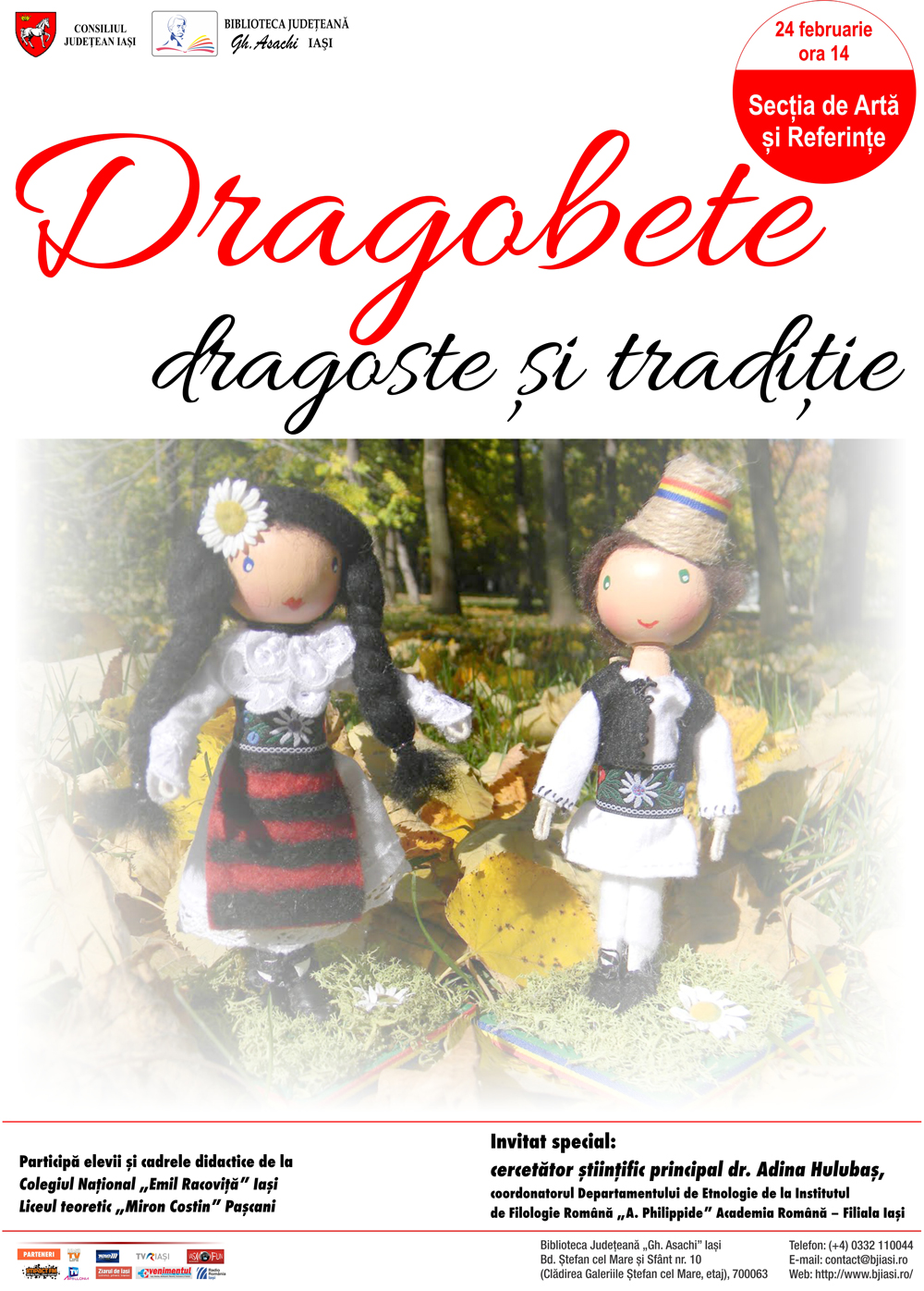 Tot mâine, de la ora 14.00, la Sala de Artă și Referințe, elevii și cadrele didactice de la Colegiul Național „Emil Racoviță” și Liceul Teoretic „Miron Costin” din Pașcani se vor întâlni dr. Adina Hulubaș, C.S. și coordonatorul Departamentului de Etnologie de la Institutul de Filologie Română „A. Philippide” (Academia Română), care le va vorbi despre semnificația acestei sărbători, despre tradiții și obiceiuri de Dragobete. Prezentarea va fi urmată de discuții interactive pe această temă. Cei prezenți se vor mai putea delecta cu vizionarea unei inedite expoziții de desen/ artă plastică și decorativă, realizate de elevii de la cele două licee și cu vizionarea unei expoziții speciale de materiale audio și albume din colecțiile bibliotecii. De asemenea, atmosfera va fi întregită de un fond muzical (pe vinil) care cuprinde melodii celebre românești de dragoste și versuri de dragoste citite de autorii sau de actori celebri.