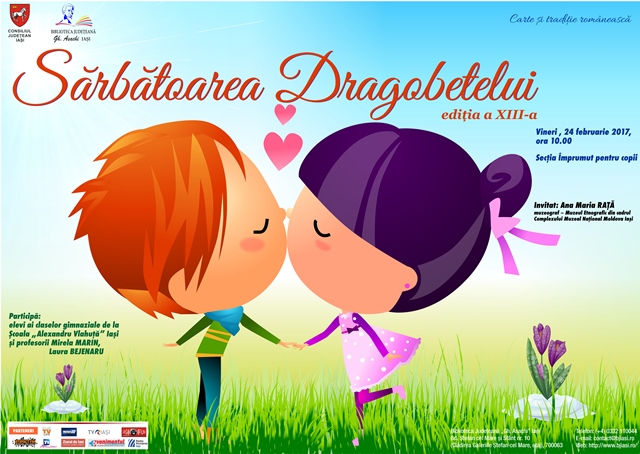 În aceeași direcție se înscriu și următoarele două activități, care se vor desfășura vineri, 24 februarie 2017, la sediul central al Bibliotecii Județene. Astfel, de la ora 10.00, la Secția Împrumut pentru copii, va avea loc ediția a XIII-a a Sărbătorii Dragobetelui – o întâlnire interactivă la care vor participa elevii claselor gimnaziale de la Școala Gimnazială „Alexandru Vlahuță”, alături de profesorii Mirela Marin (director) și Laura Bejenaru. Invitatul special este Ana Maria Rață, etnograf la Muzeul Etnografic al Moldovei (Complexul Muzeal Național „Moldova” Iași).
