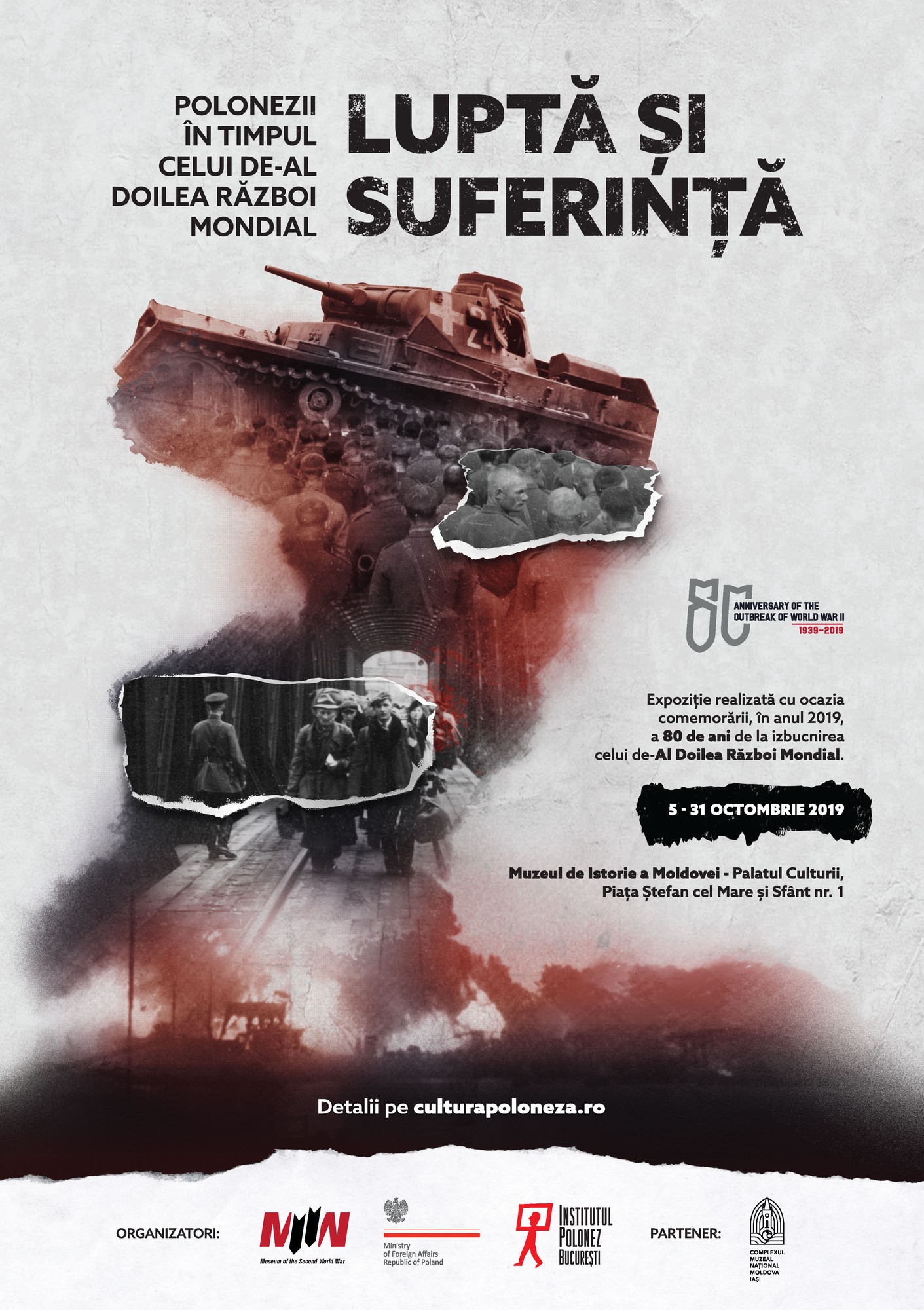 Complexul Muzeal Naţional „Moldova” Iaşi – Muzeul de Istorie a Moldovei vă invită să vizitați, în perioada 5-31 octombrie 2019, la Palatul Culturii, expoziţia „Polonezii în timpul celui de-Al Doilea Război Mondial. Luptă și suferință”, organizată de Muzeul Celui de-Al Doilea Război Mondial, Ministerul Afacerilor Externe al Republicii Polone și Institutul Polonez din București, în parteneriat cu Complexul Muzeal Național „Moldova” Iași.