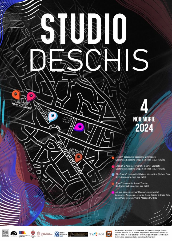 „Studio Deschis”, un proiect cultural care revitalizează scena coregrafică din Iași, își va prezenta rezultatele pe 4 noiembrie 2024, începând cu ora 12:30. Evenimentul va avea loc în diverse spații publice emblematice ale Iașului, precum Esplanada Elisabeta (Râpa Galbenă), Bulevardul Ștefan cel Mare, Strada Lăpușneanu și str. Vasile Alecsandri. Conceptul coregrafei Sandra Mavhima explorează interacțiunea dintre dans și spațiile urbane, transformând fiecare locație într-un context artistic nou, atât pentru artiști, cât și pentru spectatori.