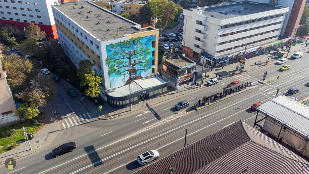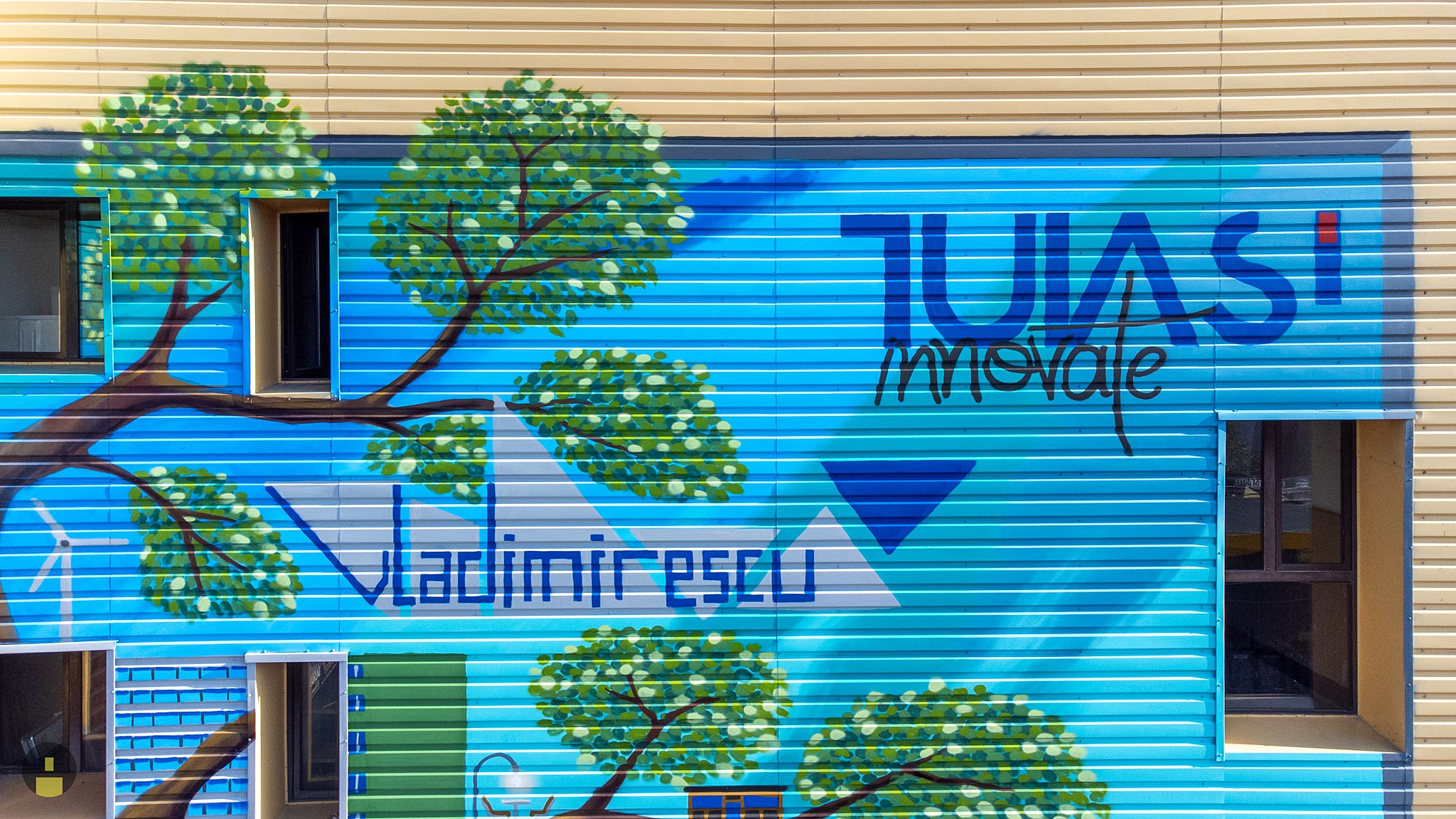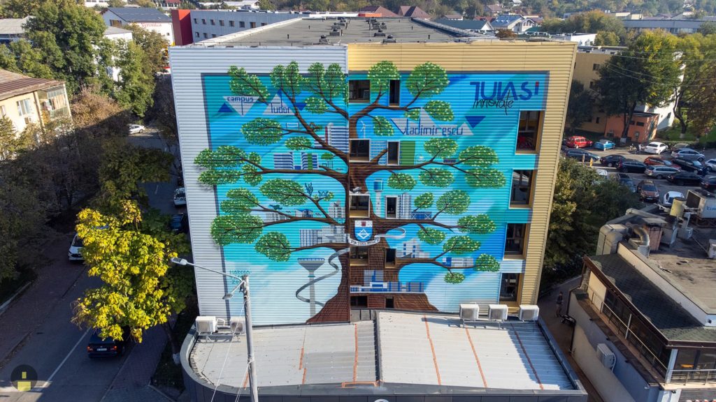 TUIASI – A fost realizat „Copacul Cunoașterii”, pictura murală spectaculoasă, de 220 de metri pătrați, care marchează intrarea în Campusul „Tudor Vladimirescu”