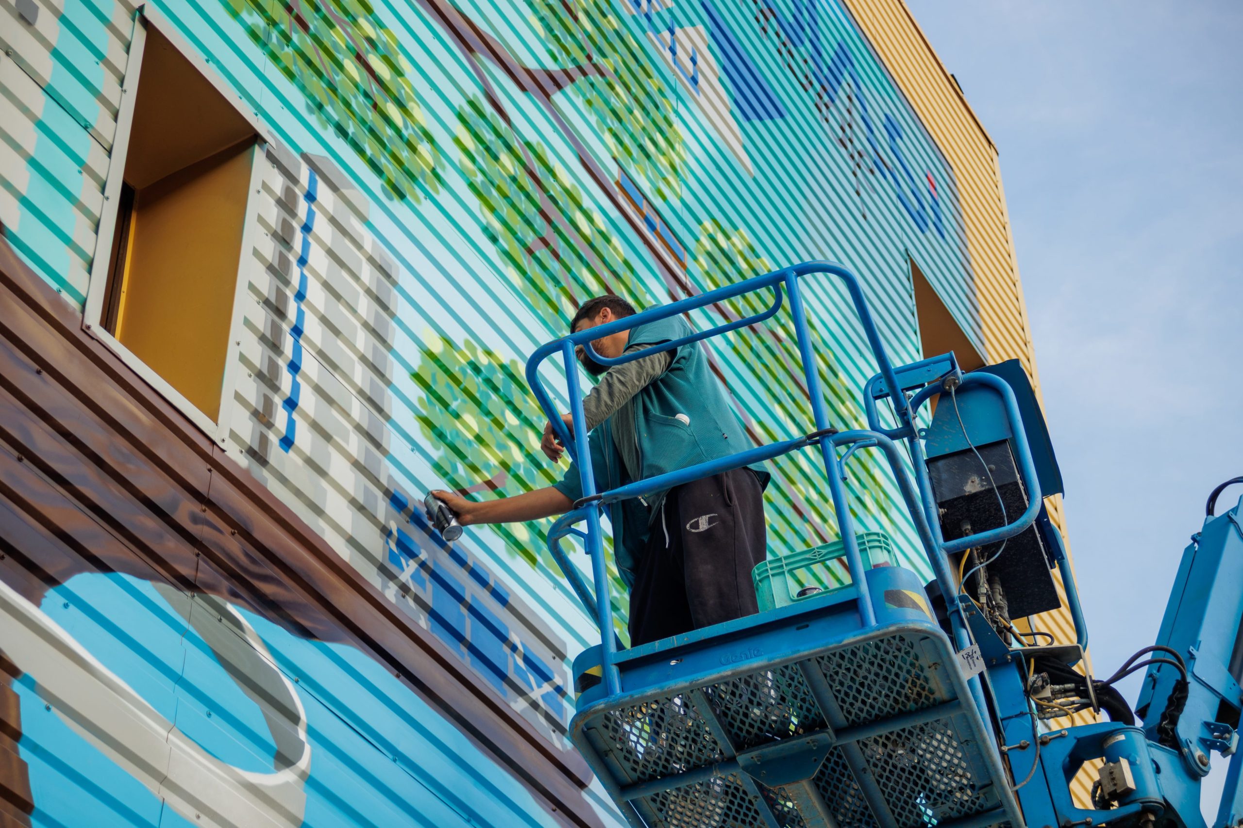 Artistul Harcea Pacea a realizat o spectaculoasă pictură murală, de 220 de metri pătrați, pe fațada căminului T18 din Campusul „Tudor Vladimirescu”.