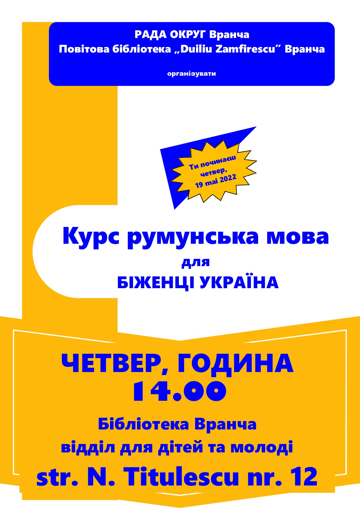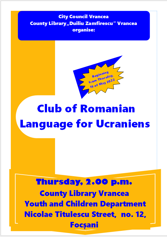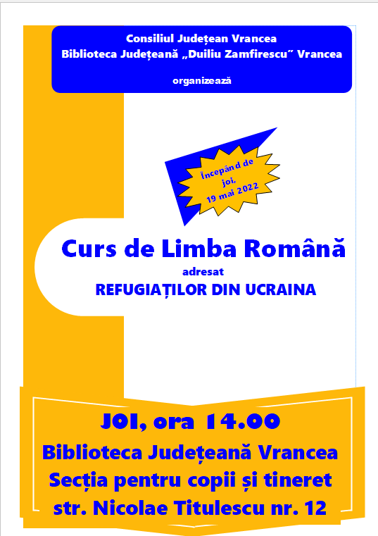 Biblioteca Județeană „Duiliu Zamfirescu” Vrancea organizează, începând de joi, 19 mai 2022, un Curs de limba română care este adresat refugiaților din Ucraina. Participanții la acest curs vor fi sprijiniți să obțină cunoștințe de comunicare în limba română. Modulurile cursului sunt structurate în funcție de gradul de dificultate şi acoperă nivelurile A1 și A2 conform cadrului european de referință.