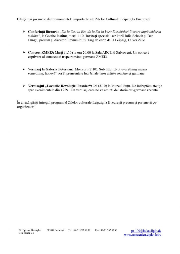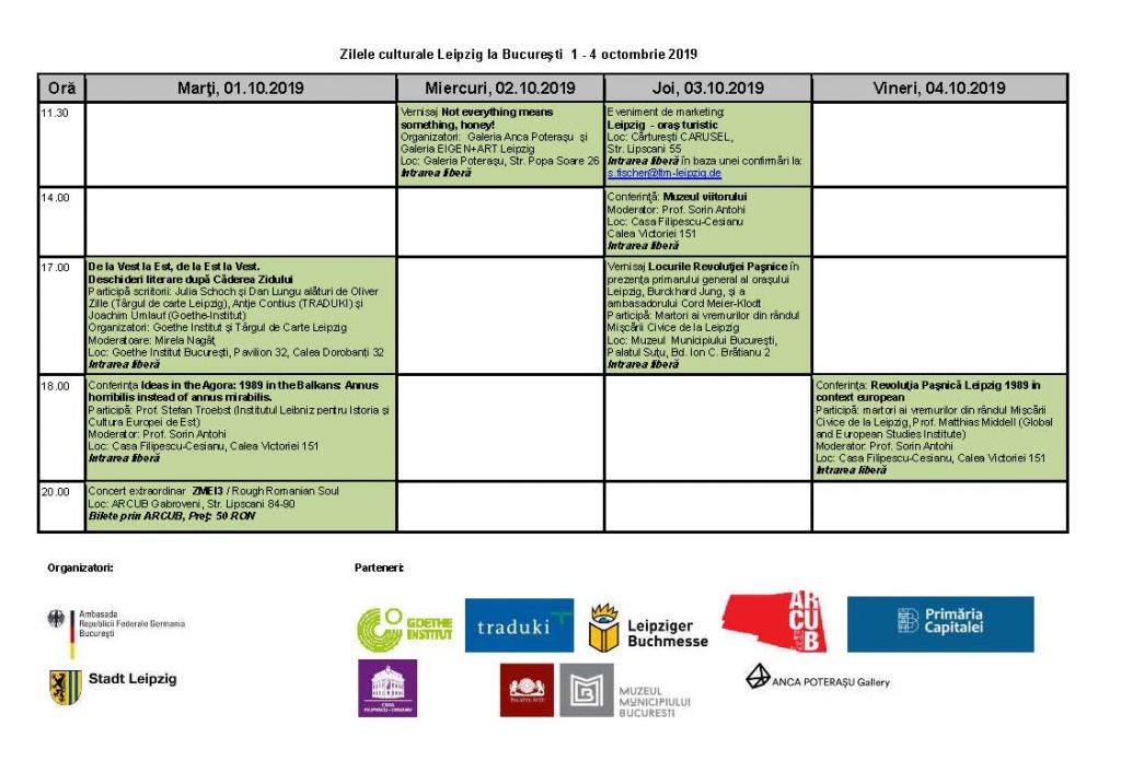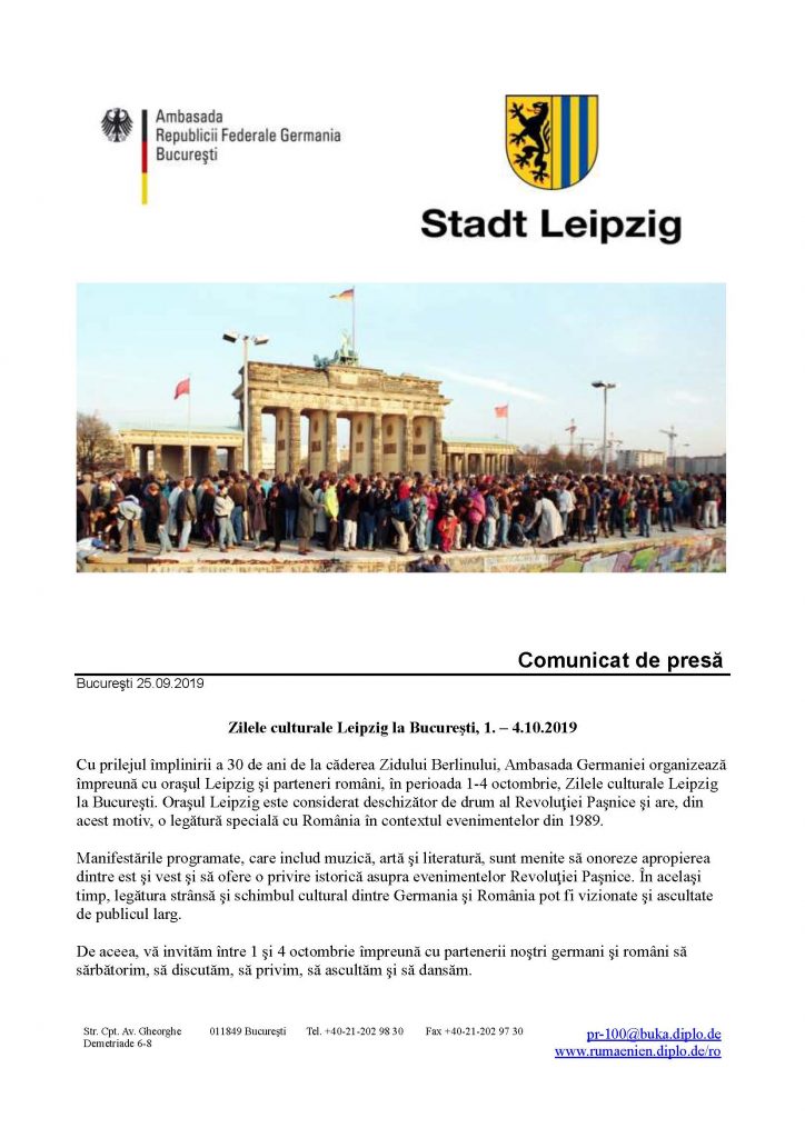 Cu prilejul împlinirii a 30 de ani de la căderea Zidului Berlinului, Ambasada Germaniei organizează împreună cu oraşul Leipzig şi parteneri români, în perioada 1-4 octombrie, Zilele culturale Leipzig la Bucureşti.