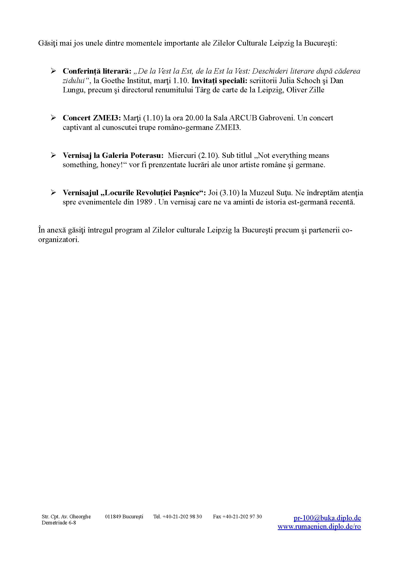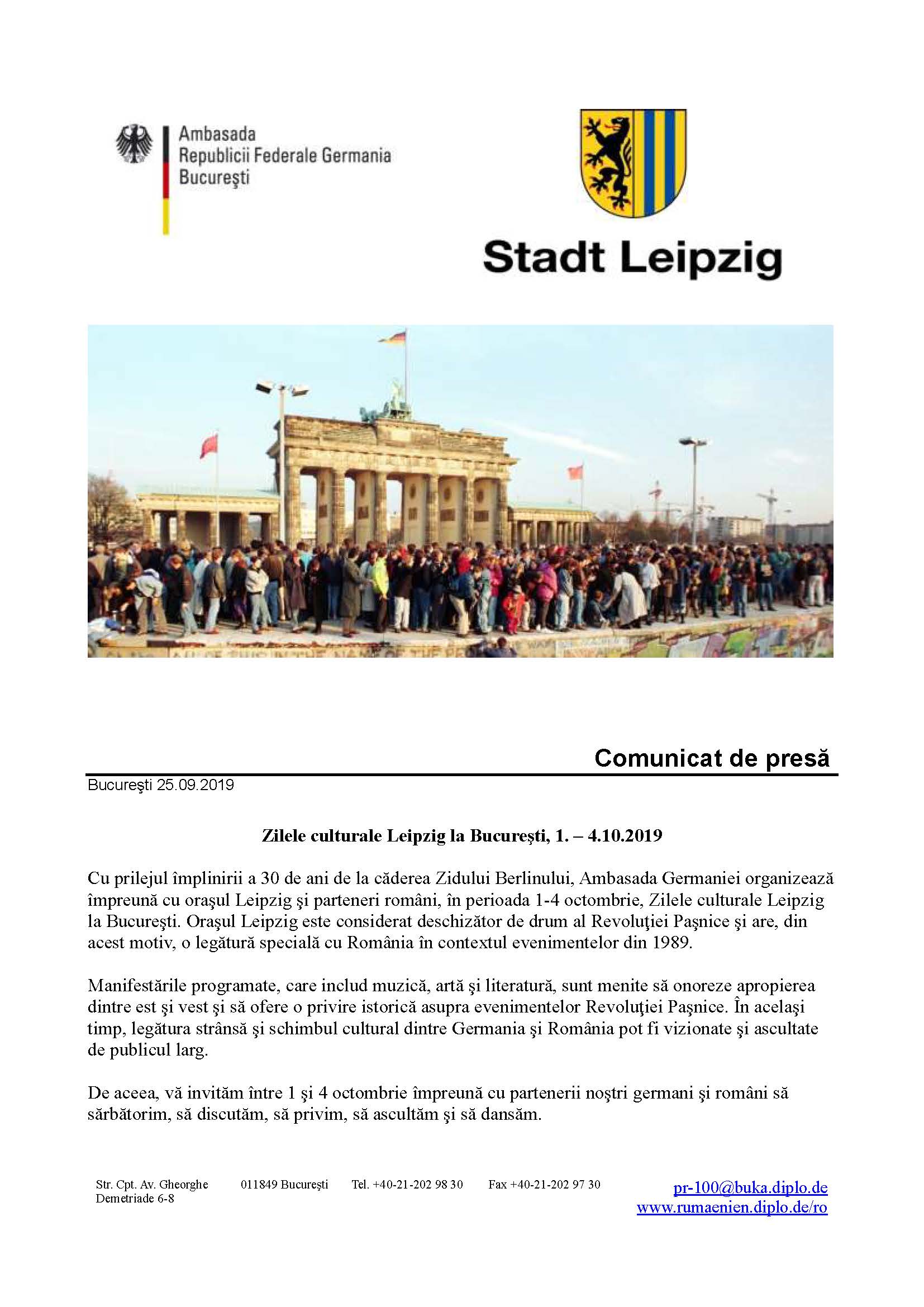 Cu prilejul împlinirii a 30 de ani de la căderea Zidului Berlinului, Ambasada Germaniei organizează împreună cu oraşul Leipzig şi parteneri români, în perioada 1-4 octombrie, Zilele culturale Leipzig la Bucureşti.
