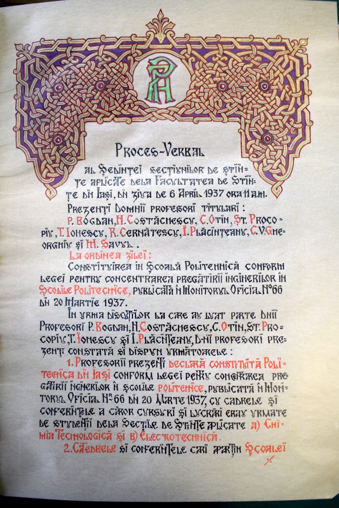 „Descoperirea Cărții de Aur a Politehnicii poate fi asimilată cu confirmarea realității unui mit. În afara modalității efectiv impresionante de realizare tehnică și artistică a acesteia, în afară de caligrafia deosebită, începutul acestei cărți reprezintă dovada vie a unui moment esențial din istoria Politehnicii ieșene și anume desprinderea într-o entitate de sine stătătoare”, a precizat prof. univ. dr. ing. Dan Cașcaval, rectorul TUIASI.