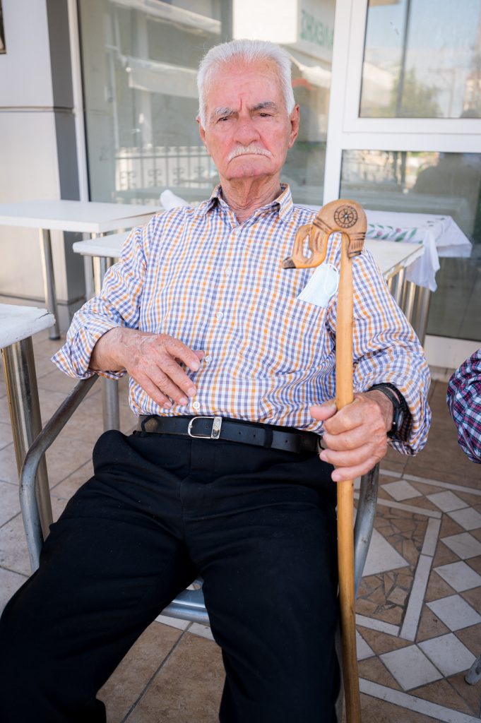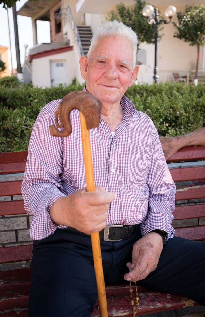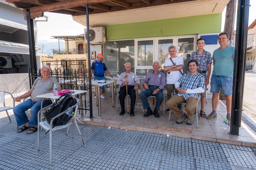 Unul dintre papi, bătrânii satului, ne arată în direcția Muntelui Olimp, cel mai înalt din Grecia, și schimbăm discuția… Ne spune cum mergeau în tinerețe cu oile, prin mai multe hoare, sate – prin toată Elada… Aveau oi multe pe vremuri. Acum – tora – doar două-trei… În zilele acestea, sătenii se ocupă cu agricultura, livezile de kiwi…