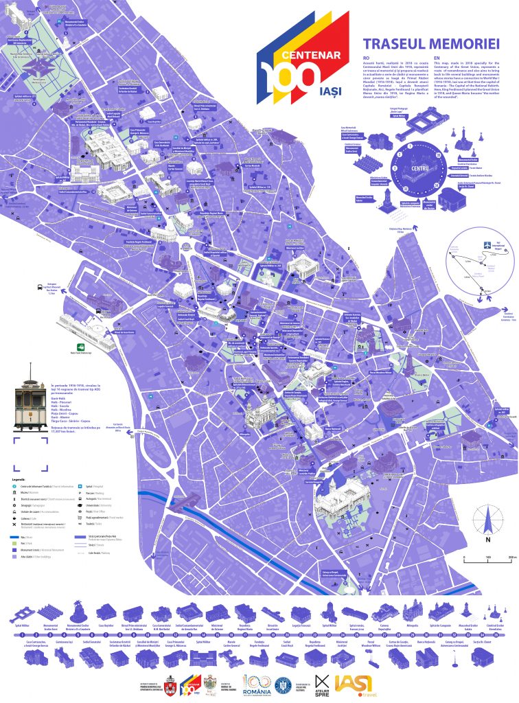 Depozit al amintirilor, „Traseul Memoriei” ne oferă ocazia intrării în contemporaneitate cu figuri marcante ale istoriei noastre, precum Regele Ferdinand I, Regina Maria, Generalul Henri Mathias Berthelot, Ion I.C. Brătianu, Ecaterina Teodoroiu, George Enescu și mulți alții. Urmând traseul celor 35 de obiective reprezentate axonometric pe hartă, putem călca pe urmele eroilor Marii Uniri, reconstituind, cu propriii noștri pași, file din istoria Iașului.