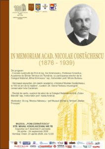 Muzeul Ştiinţei şi Tehnicii „Ştefan Procopiu” din cadrul Complexului Muzeal Naţional „Moldova” Iaşi organizează vineri, 24 aprilie 2026, începând cu ora 12.00, la Muzeul „Poni – Cernătescu” (str. Mihail Kogălniceanu, nr. 7B), manifestarea omagială „IN MEMORIAM NICOLAE COSTĂCHESCU”.