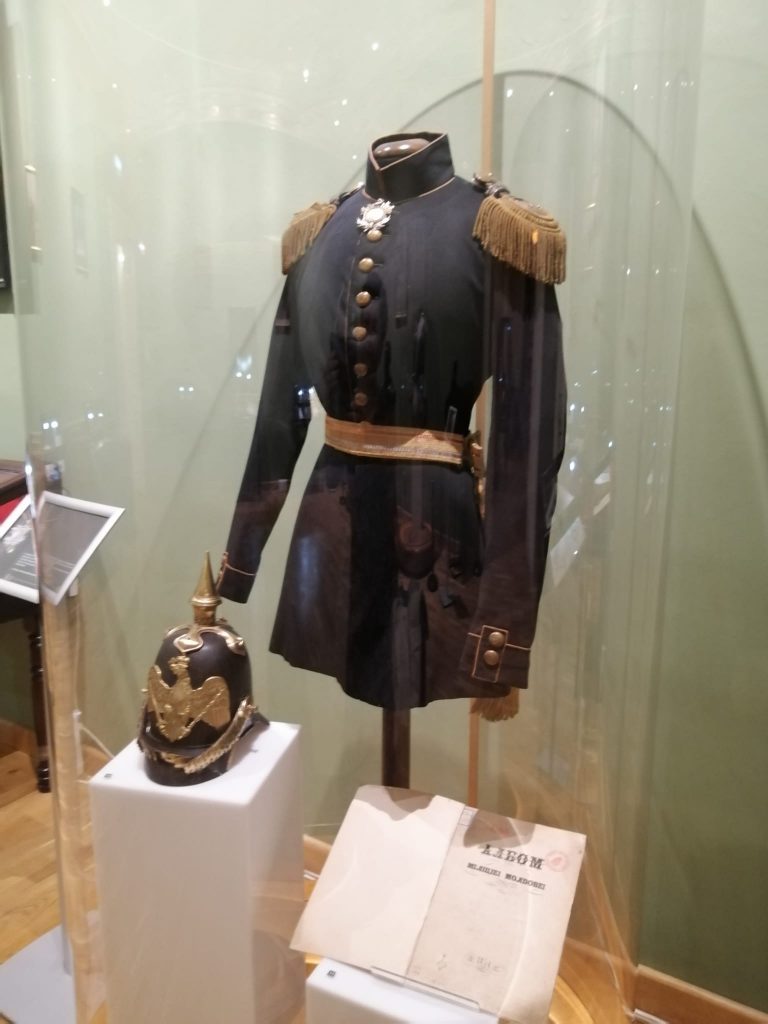 Cristina Constantin: Sigur că da, așa cum am menționat și în prezentarea expoziției, nu neapărat numai cu Iașul, cu Moldova în special, am vrut să aibă și o astfel de relevanță. De exemplu, în cadrul expoziției se regăsește un uric din vremea lui Ștefan cel Mare. De asemenea, se găsește un imn dedicat domnitorului Alexandru Ioan Cuza în ianuarie 1866, cu o lună înainte de abdicarea forțată a acestuia. Cea mai veche fotografie din colecțiile muzeului nostru care se află în cadrul expoziției este o fotografie realizată la Iași în 1858. Sunt obiecte care au aparținut mareșalilor Alexandru Averescu și Constantin Prezan care au avut un rol important în perioada Primului Război Mondial în luptele care au fost aici pe frontul din Moldova. De asemenea, uniformele care au aparținut Reginei Maria și Regelui Ferdinand, uniforme folosite în perioada Primului Război Mondial. Ori, clădirea în care expoziția se află acum este clădirea în care se afla cartierul general al Regelui Ferdinand și aceste obiecte, cumva, s-au reîntors în locuri în care au mai fost. Memoria timpului funcționează în cazul acestor obiecte.