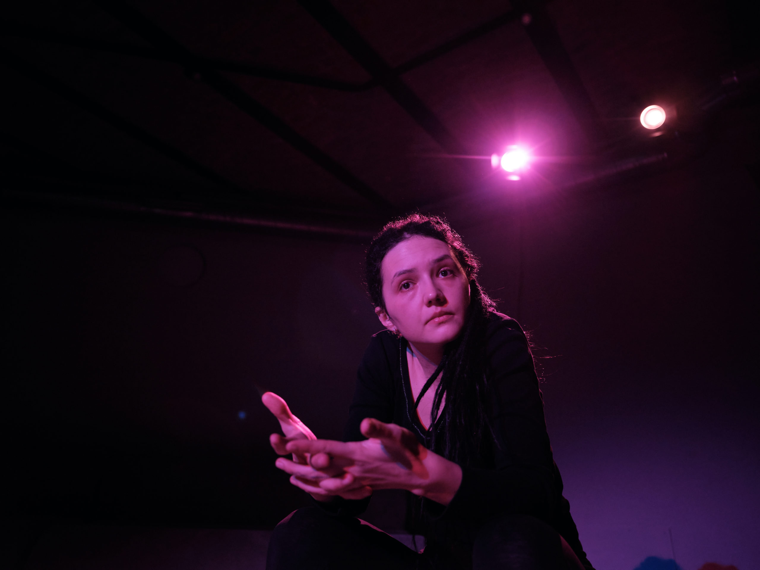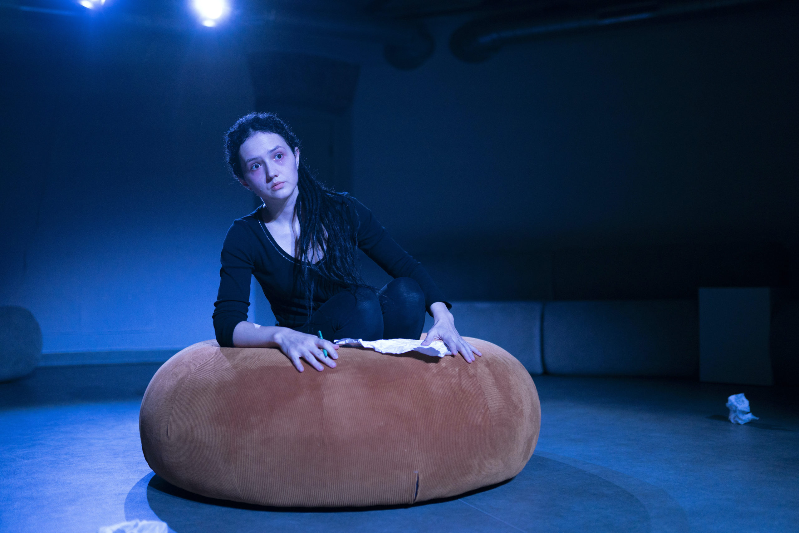 Andreea Jighirgiu Darie: Nu cred că ne-am pus o întrebare. Noi am avut o experiență acum mulți ani în urmă. Eu am făcut Ofelia la Cosmin, Cosmin își dădea un examen de regie pe scena Hamlet-Ofelia. E adevărat că el a făcut o combinație din mai multe scene. În orice caz, personajul Ofeliei era în același moment de instabilitate. Era o scenă cu Hamlet. Și atunci, pe mine m-a marcat atât de profund experiența pe care am avut-o cu Cosmin, care a fost făcută tot în stilul teatrului sărac, să spunem, încât ani mai târziu m-am gândit să scriu acest text. Și după ce am scris acest text, mi-am dat seama că eu nu-l pot face decât dacă îl voi face cu Cosmin, pentru că el… noi doi, împreună, am înțeles, la momentul potrivit, acum mulți ani de zile, frecvența aceea a Ofeliei și cred că asta am încercat să redăm noi aici, să căutăm exact acea frecvență, acea vibrație a ei de instabilitate.