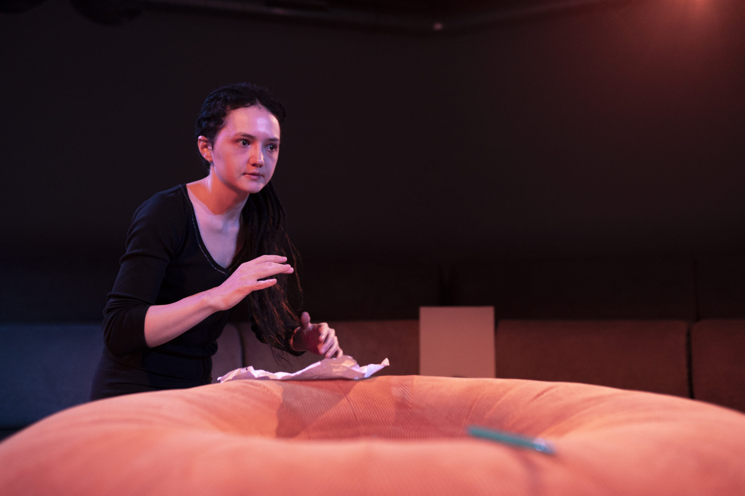 Andreea Jighirgiu Darie: Cred că este provocator pentru că nu conține repere, cum trece de la o idee la alta sau care sunt ideile. Sunt replici în care nu e clar ce idei are, cum trece de la una la alta, ce vrea să spună, ce își dorește, ce nu-și dorește. E foarte dificil de… de găsit pilonii, cum ajungem din punctul A în punctul B? Textul nu… nu-ți oferă. Cum se ajunge din punctul A în punctul B. Asta e ceva ce tu trebuie să cauți singur și să-ți aduci aminte, de fiecare dată, drumul pe care l-ai parcurs, pentru că ai atât de multe posibilități de a ajunge din punctul A în punctul B, încât tu, când ai ales o cale, trebuie să nu uiți că aceea era calea și nu oricare alta. Dar, în același timp, textul îți permite ca influența reacțiilor și emoțiilor pe care le simți tu, pe baza lor, să poți să te deplasezi spre următorul punct ș i nu ca-n teatru, între anumite jaloane pe care tu, în mod matematic, trebuie să le respecți. Aici am bucuria de a mă lăsa purtată dintr-o emoție în alta și să hotărăsc, pe moment, în direct, spontan, cum doresc să continui. Ceea ce e, pe de o parte, o responsabilitate, pe de altă parte, e un lucru inedit pe care nu l-am mai făcut.