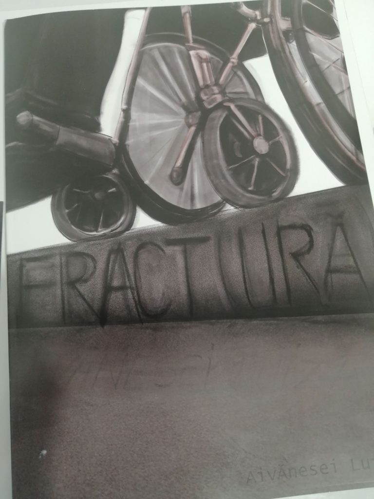 A pornit de la o experiență personală, eu fiind persoană cu dizabilități, tot timpul am simțit cumva că societatea noastră e fracturată, pentru că incluziunea persoanelor cu dizabilități încă nu există și de multe ori, persoane cu dizabilități sunt văzute mai mult ca un obiect de milă și mai puțin ca niște oameni normali, funcționali în societate. Pornind de la fractura mea emoțională, practic, am căutat să discut și cu alte persoane și mi-am dat seama că, chiar dacă suntem niște oameni diferiți, avem niște lucruri în comun și principalul lucru este forma de discriminare pe care am trăit-o, de la ce înseamnă incluziunea socială, generală până la cea educațională, la locuri de muncă… În felul ăsta, am creat un roman grafic care conține 32 de pagini și practic, ilustrez ce înseamnă să fii persoană cu dizabilități în societate. Eu mi-aș dori să continui proiectul ăsta pentru că este asumat incomplet, deoarece incluziunea este un proces continuu. Eu n-am… n-am terminat să vorbesc despre incluziune și incluziunea nu se termină clar aici. Incluziunea începe cu noi și cumva se termină tot cu noi. Și aș vrea ca proiectul meu să aducă puțin mai multă claritate în ceea ce înseamnă să fim incluzivi. Și cred că un mod ușor de înțelege asta e vizual, pentru că mai întâi învățăm vizual și mai apoi prin alte modalități.