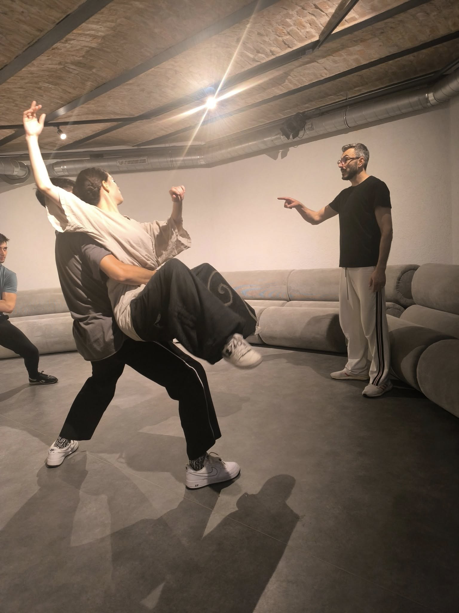 Este pentru prima dată când vin în România și pot spune cu toată sinceritatea: e o plăcere! Dansul contemporan are aici o energie cu totul diferită față de ceea ce întâlnesc, de obicei, la Paris sau în Italia. Am descoperit, cu bucurie, cursanți extraordinari, foarte bine pregătiți, și o atmosferă minunată. Totul a fost impecabil organizat. În Franța sau Italia, accentul cade adesea pe tehnică. Aici însă, am găsit studenți extrem de curioși și atenți, care au înțeles rapid ceea ce le-am transmis. Am reușit să pregătim performance-ul din această seară în doar 12 ore de atelier și rezultatul a fost, pur și simplu, extraordinar! Pentru mine, dansul contemporan înseamnă nu doar tehnică, ci și emoție. Iar aici am simțit multă sensibilitate. Am lucrat împreună exerciții de măiestrie, explorând metode precum „Release technique”, lucru la podea și mișcare intensă, puternică. Cursanții m-au inspirat să creez coregrafia atât în interiorul clădirii, cât și în amfiteatru. Au avut de improvizat, dar și de urmat structura coregrafică. Pentru mine, improvizația este esențială în exprimarea trăirilor prin muzică, spațiu și tehnică.