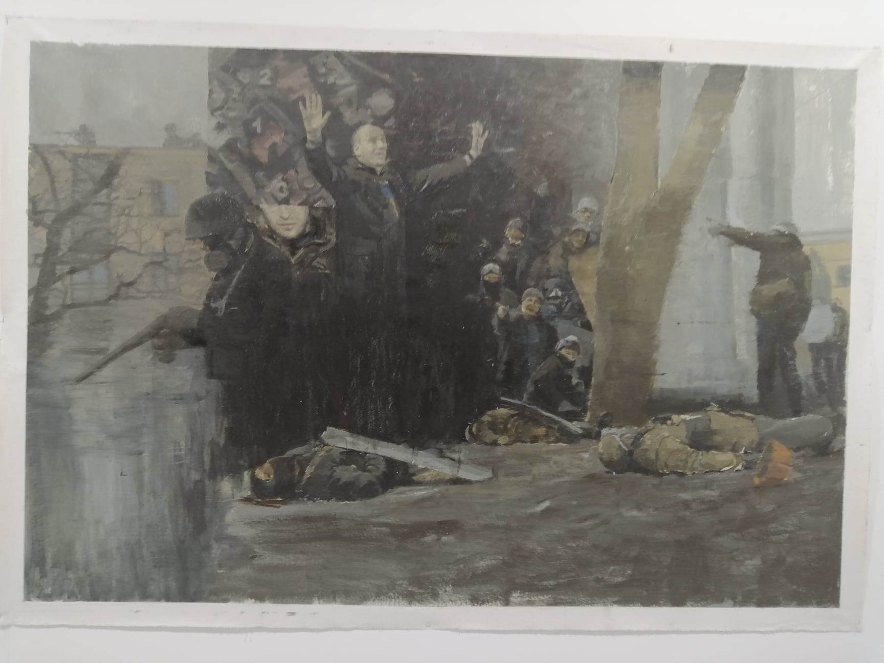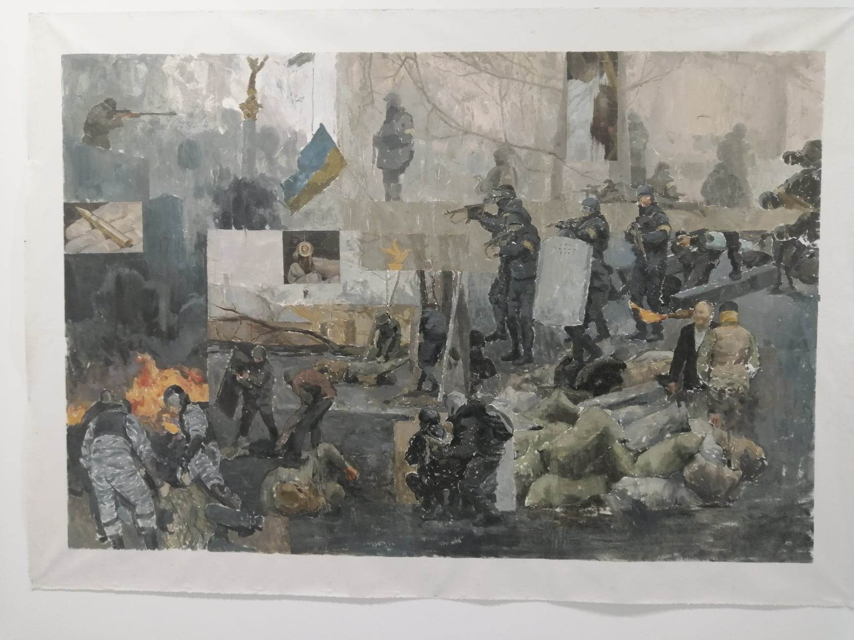 Ciprian Tokar: Am considerat că, criza din Ucraina, în complexitatea ei, ascunde informații care, probabil, au fost transmise de discursurile oficiale, dar nu în totalitate și, oarecum, încerc să aduc niște informații alternative despre aceste evenimente care s-au întâmplat în Ucraina, despre revoluție, despre război. Am preluat niște imagini de pe internet, din mass-media, din rețelele de socializare pe care le-am prelucrat, le-am manipulat pictural, așa încât să le transform în imagine pictată. Am încercat să adaptez de fapt niște imagini fotografice în mediul pictural.